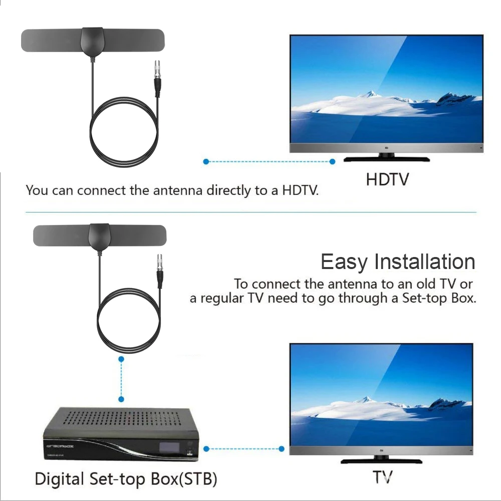 Сколько бесплатных каналов вы можете получить?Dtv.gov/maps: Узнайте, где расположены вещательные башни в вашем регионе.Антенна веб: Узнайте, сколько бесплатных каналов доступно у ваших местных вещателейПредоставляет списки доступных каналов, карты покрытия и карты анализа динамического сигнала для любого местоположения.Пожалуйста, обратите внимание!1. Если у вашего телевизора нет встроенного тюнера, необходимо установить телеприставка для прослушивания сигналов HD TV.2. Если сигнал не удовлетворяет или доступно только несколько каналов, попробуйте подключить усилитель. Держите телевизионную антенну вдали от источников помех, держите телевизионную антенну вдали от таких больших устройств энергопотребления, как кондиционер, Лифт, Фен и микроволновая печь и т. Д. Зоны с большими препятствиями, такими как долины, горы, здания и т. Д.3. Сила сигнала антенны может варьироваться в зависимости от расстояния от башни, местности и погоды. При необходимости Установите антенну в другом месте. Лучше всего, чтобы антенна была в прямой видимости с ТВ-башней и избегайте препятствий. Всегда повторно Сканируйте каналы после перемещения антенны.