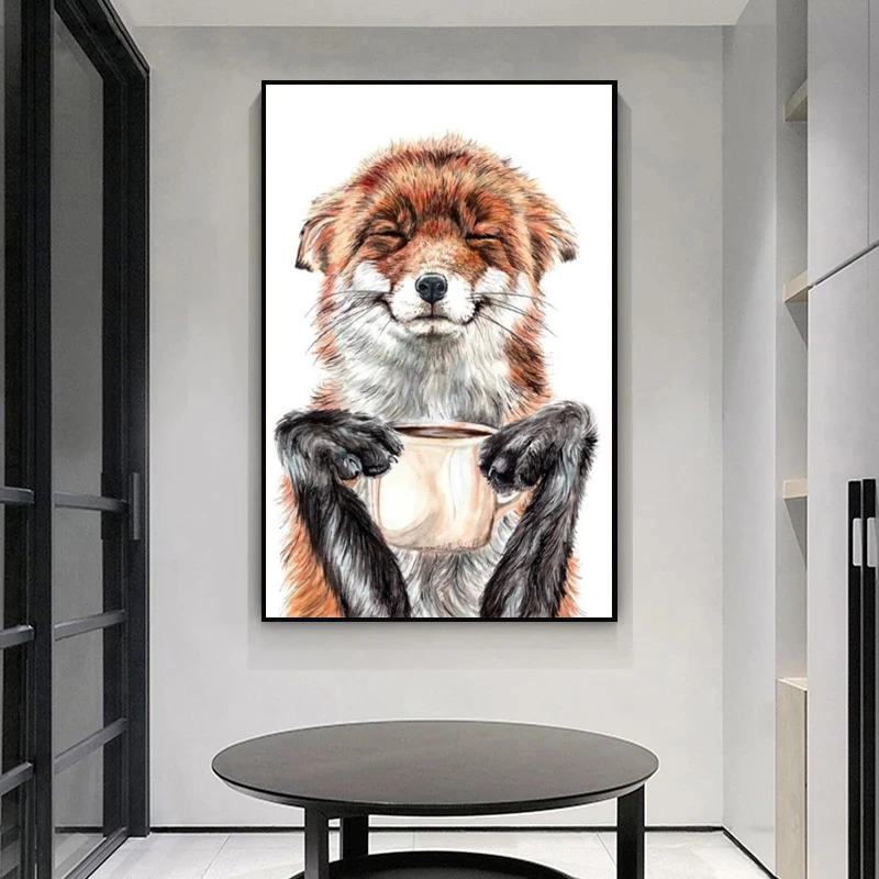 Абстрактная лиса, питьевая кофе, фотография с современными животными и плакатами, Настенная картина для гостиной, домашний декор