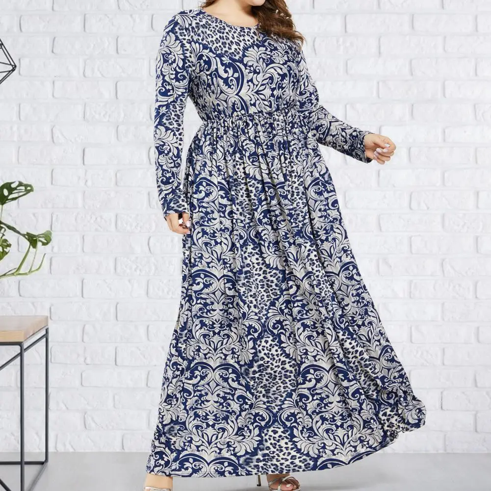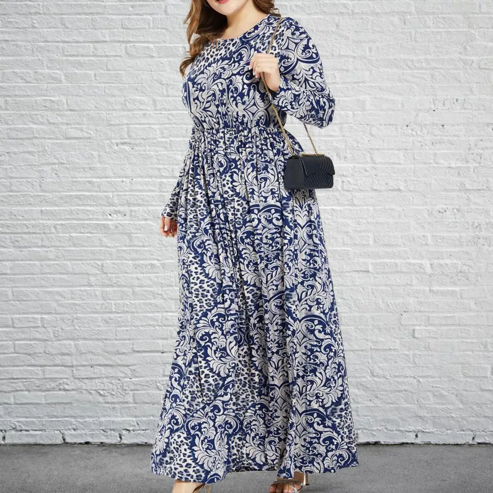 Женское платье макси с цветочным принтом, осенне-зимнее богемное платье с большим подолом и круглым вырезом, с эластичным поясом