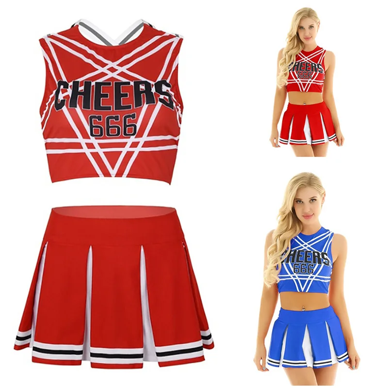 Женский Школьный костюм Cheerleader, Одежда для танцев, комплект из красной и синей летней юбки для девочек, укороченный топ, сексуальное платье