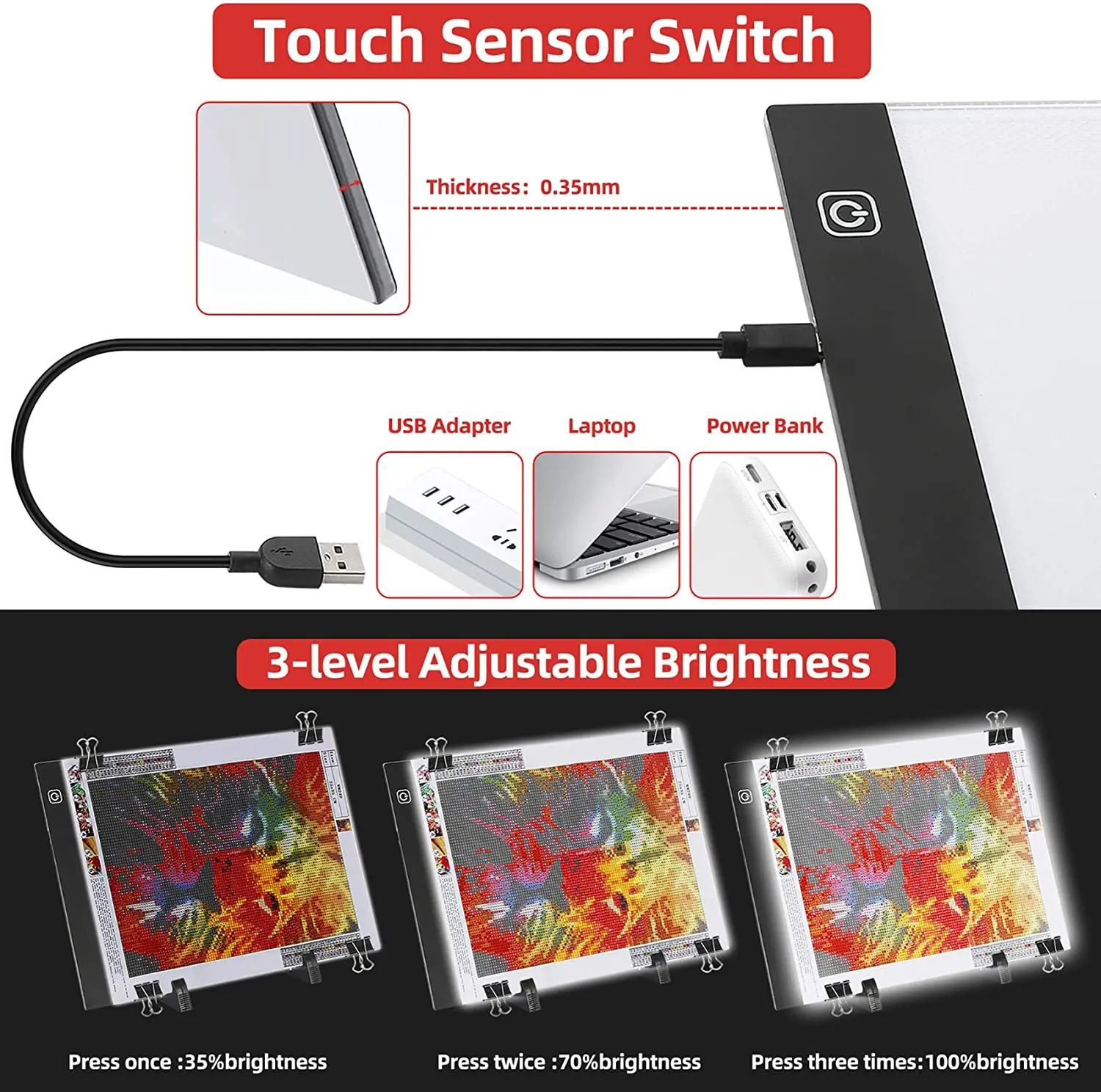 -Источник питания через usb-кабель, что означает, что его легко подключить к любому usb-порту, например, компьютеру, usb-адаптеру или даже мобильному источнику питания, а также его ультратонкий и легкий дизайн, так что вы можете носить его с собой. Оснащен сенсорным датчиком, чтобы облегчить управление, включить/выключить или настроить яркость, легко управлять с помощью касания