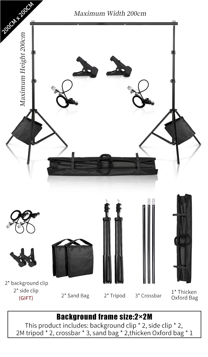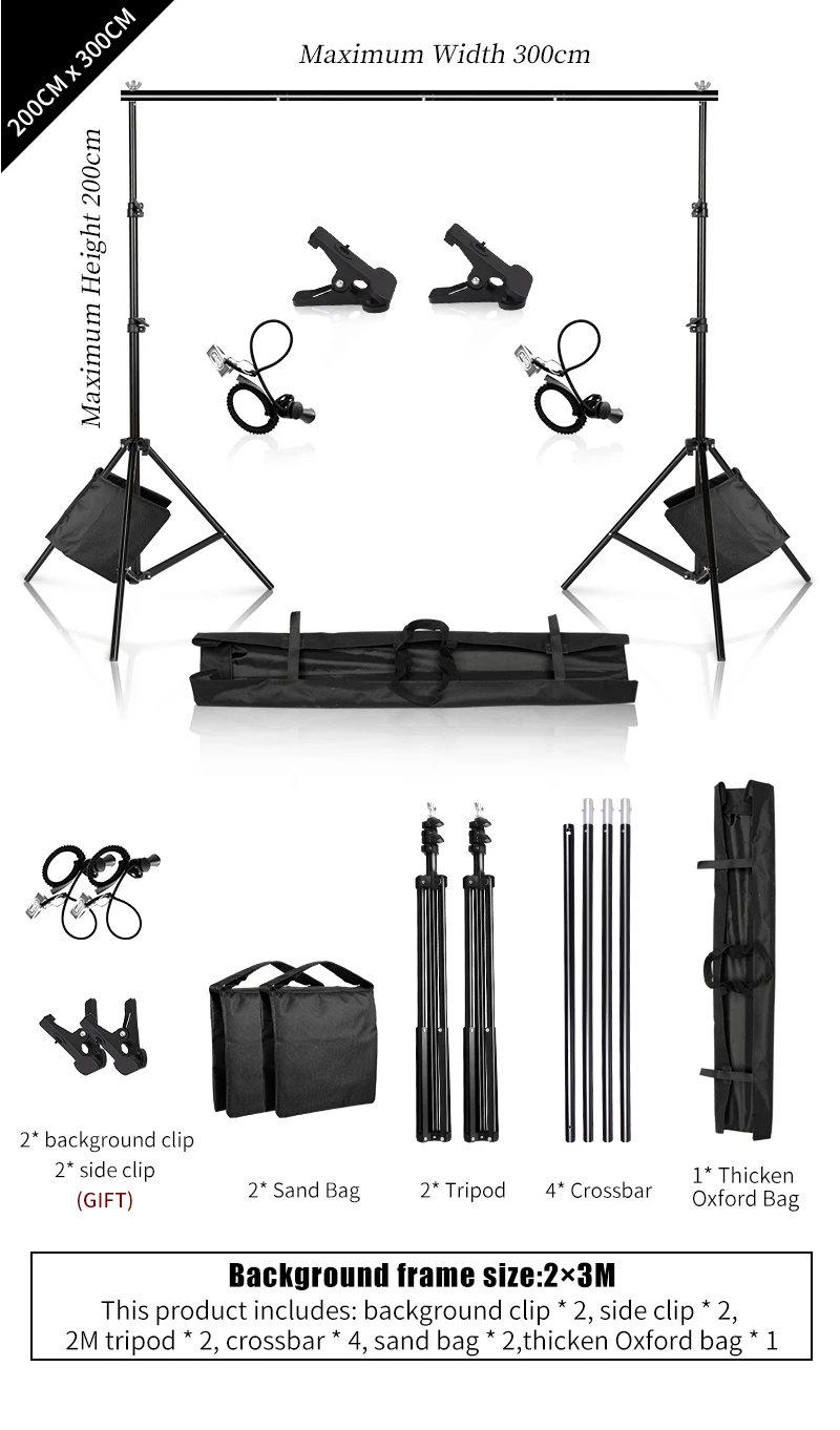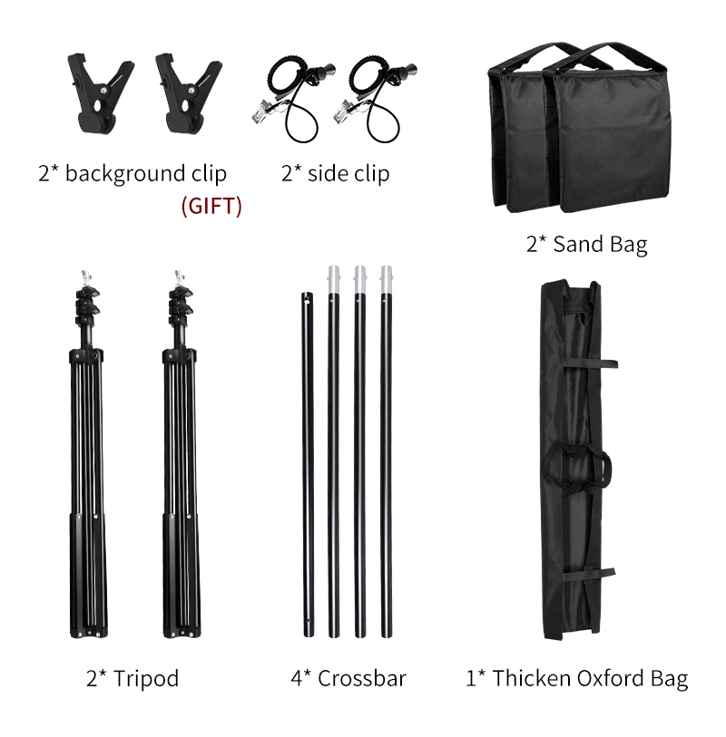 2 x подставка для фона1 x комплект перекладин для фона2 х мешков с песком2 x Пластиковые зажимы2 x зажимы для фона1 х Портативная сумка