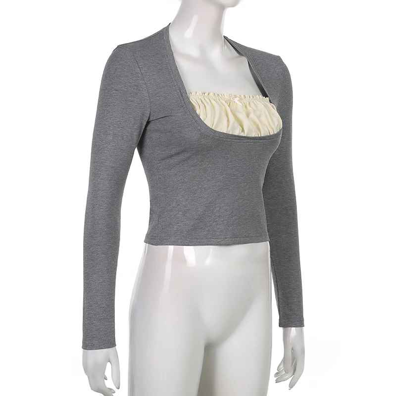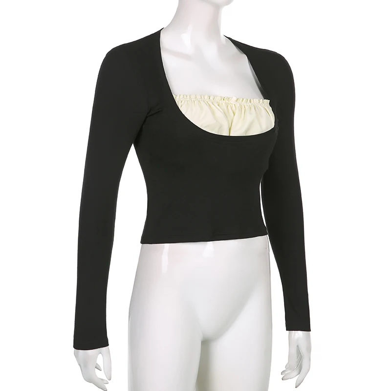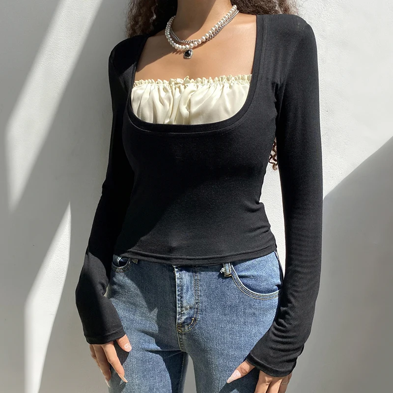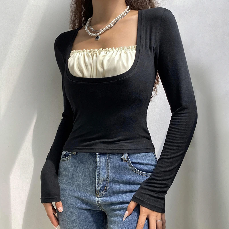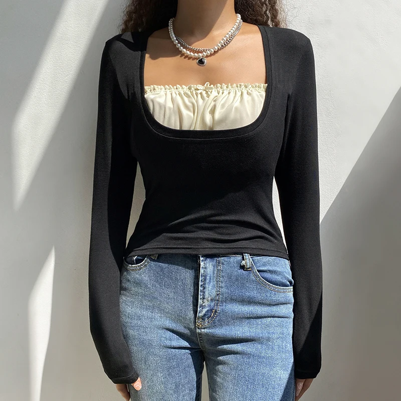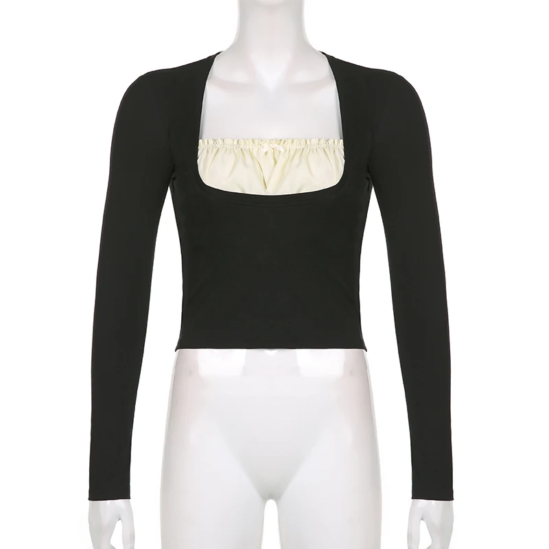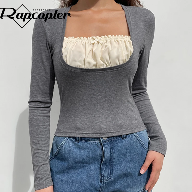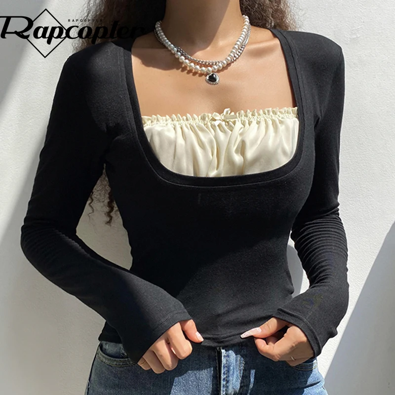 УКОРОЧЕННЫЙ ТОП Rapcopter y2k с оборками, Милая футболка с бантом, Заплатанные черные пуловеры с длинным рукавом, ретро, гранж, Fairycore, Корейская женская шикарная футболка