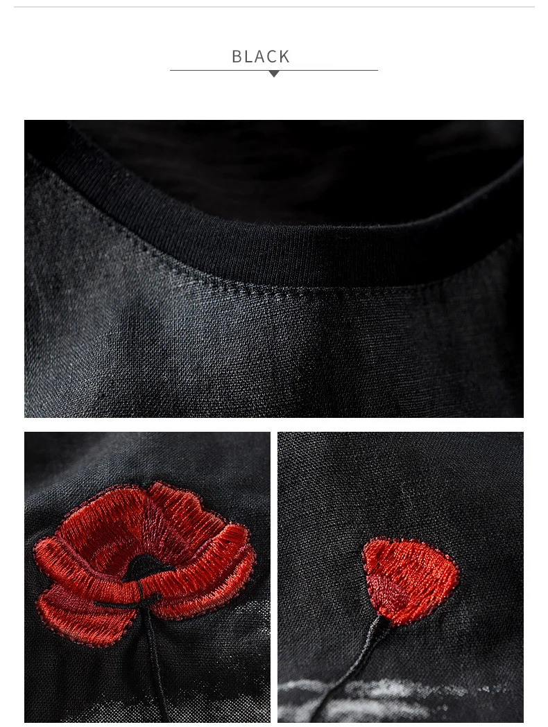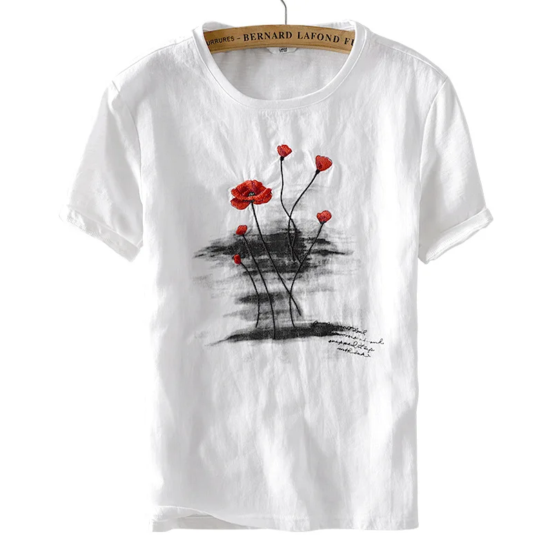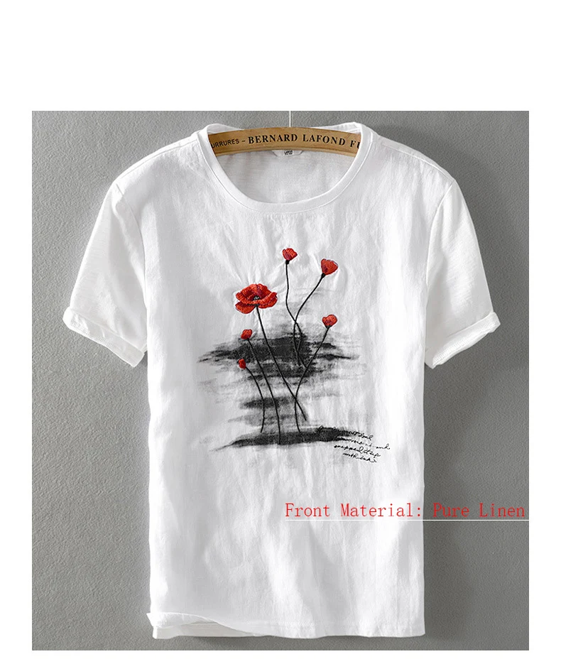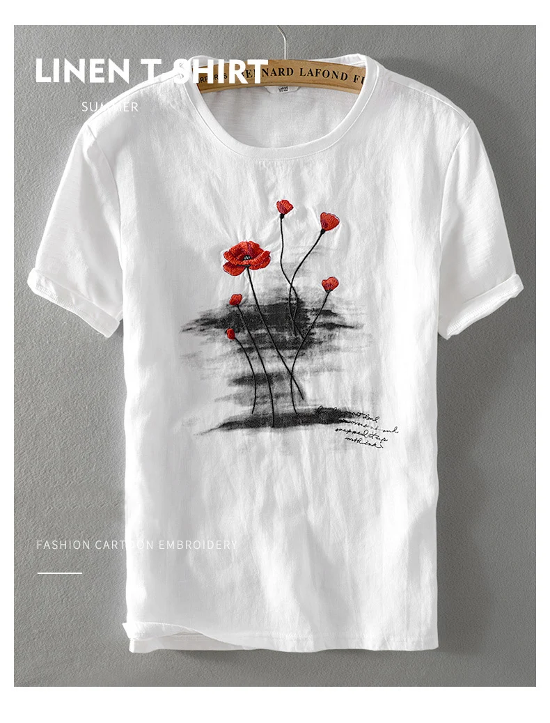Футболка мужская из хлопка и льна, модная классическая Повседневная рубашка с вышивкой красной розы, с коротким рукавом и круглым вырезом, Белый Топ, на лето