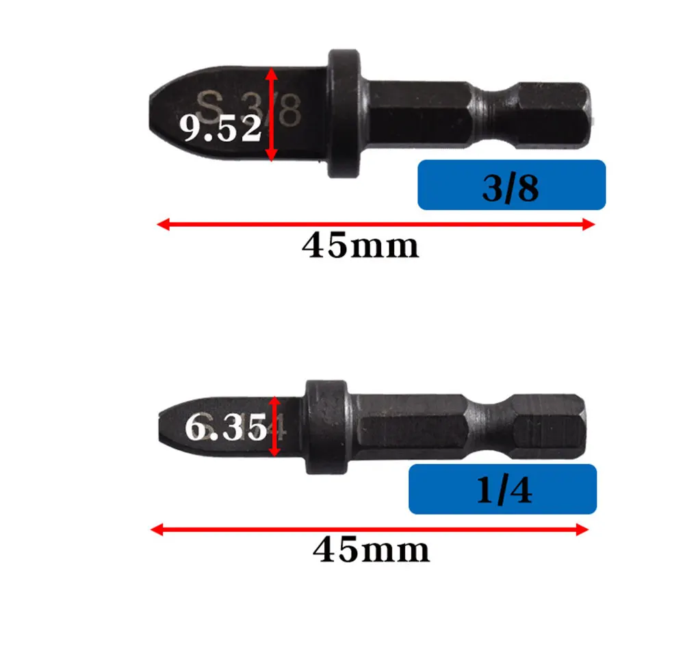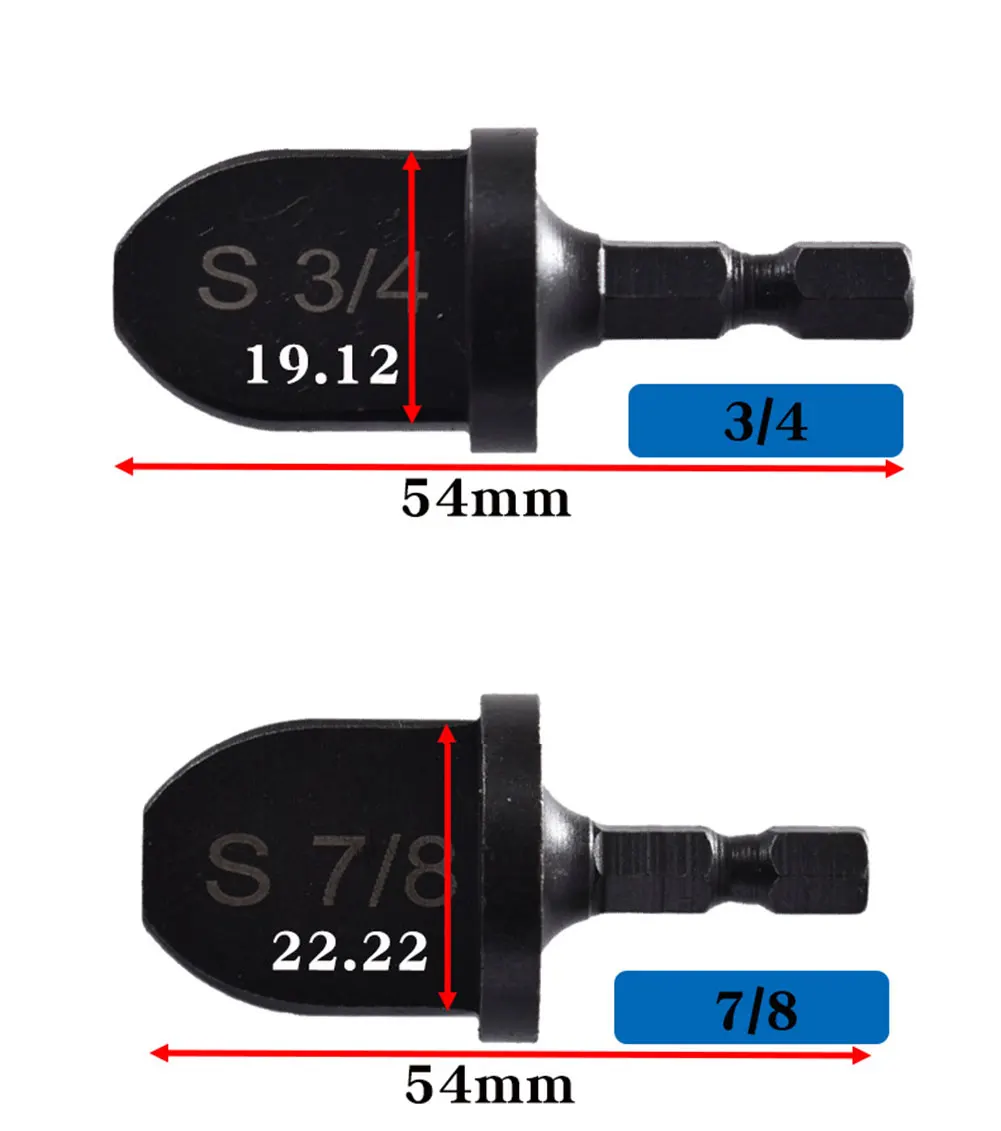 Технические характеристики: 7/8 (22,2 мм), 3/4 (19 мм), 5/8 (15,9 мм), 1/2 (12,7 мм), 3/8 (9,5 мм), 1/4 (6,3 мм)