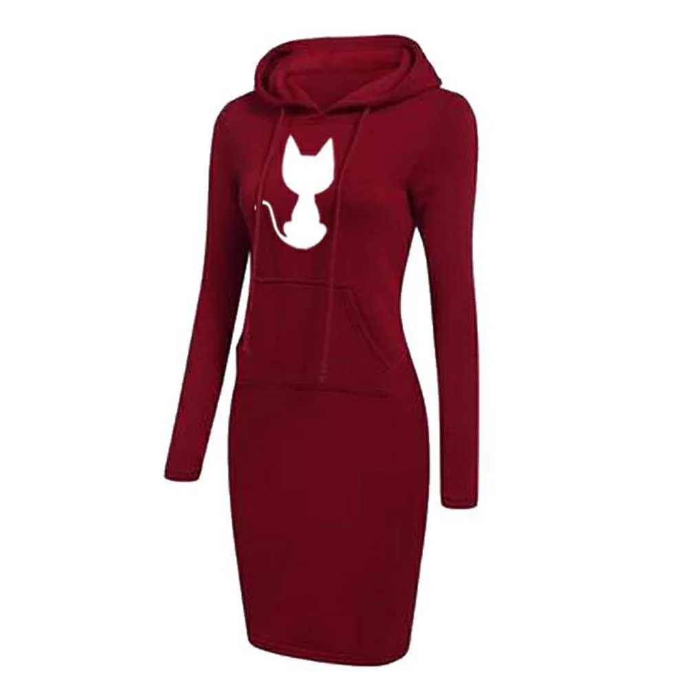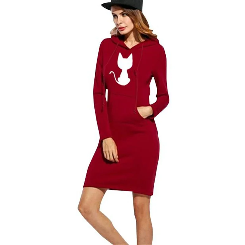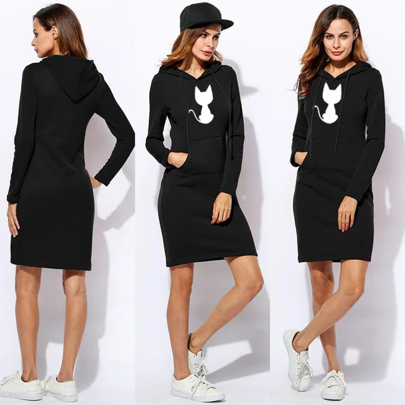 Женское классическое платье с капюшоном средней длины, модная Толстовка с принтом милого кота, теплая толстовка с длинным рукавом для осени и зимы