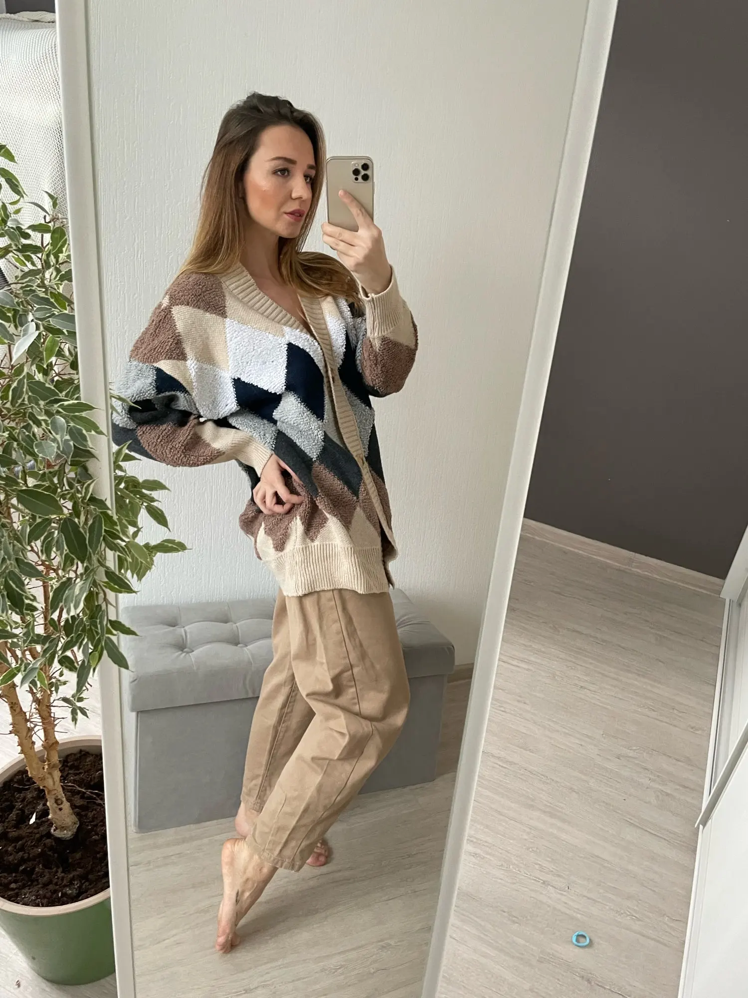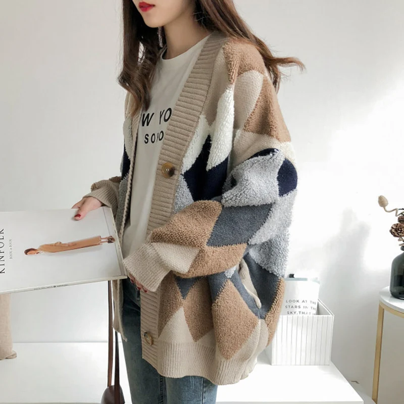 Женский кардиган в клетку Unaiza, повседневный Свободный джемпер с рукавами-фонариками и V-образным вырезом, вязаный кардиган оверсайз для осени и зимы