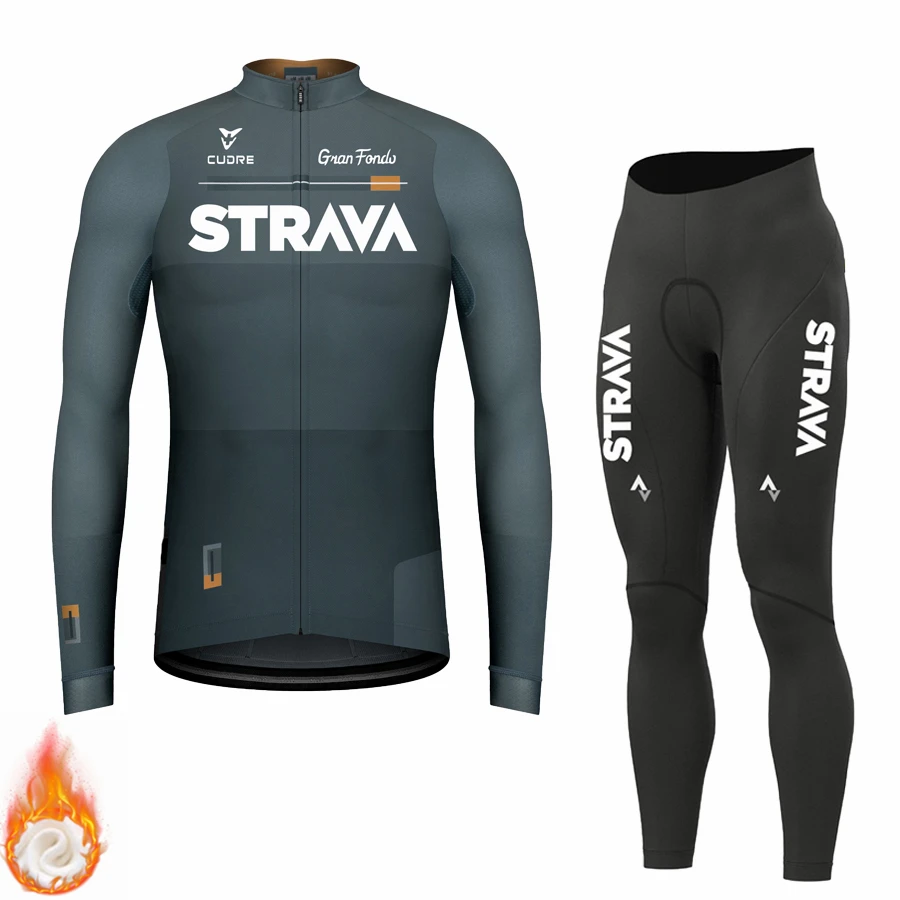 Трикотажный комплект для велоспорта STRAVA, теплое флисовое пальто с длинным рукавом, куртка, одежда для велоспорта, комбинезон с 19D гелевыми подкладками, зимние велосипедные костюмы