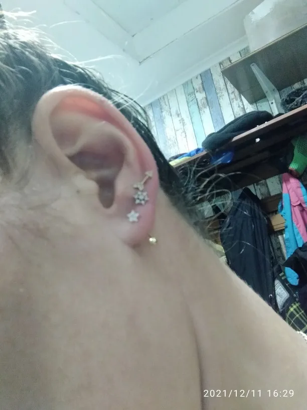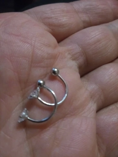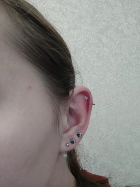 Хорошие серёжки, серебряная проба есть. Пришли в своём контейнере. Можно надевать и в мочку, но для неё диаметр крупноват, мне больше понравилось в хеликс-проколе.