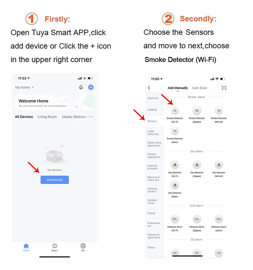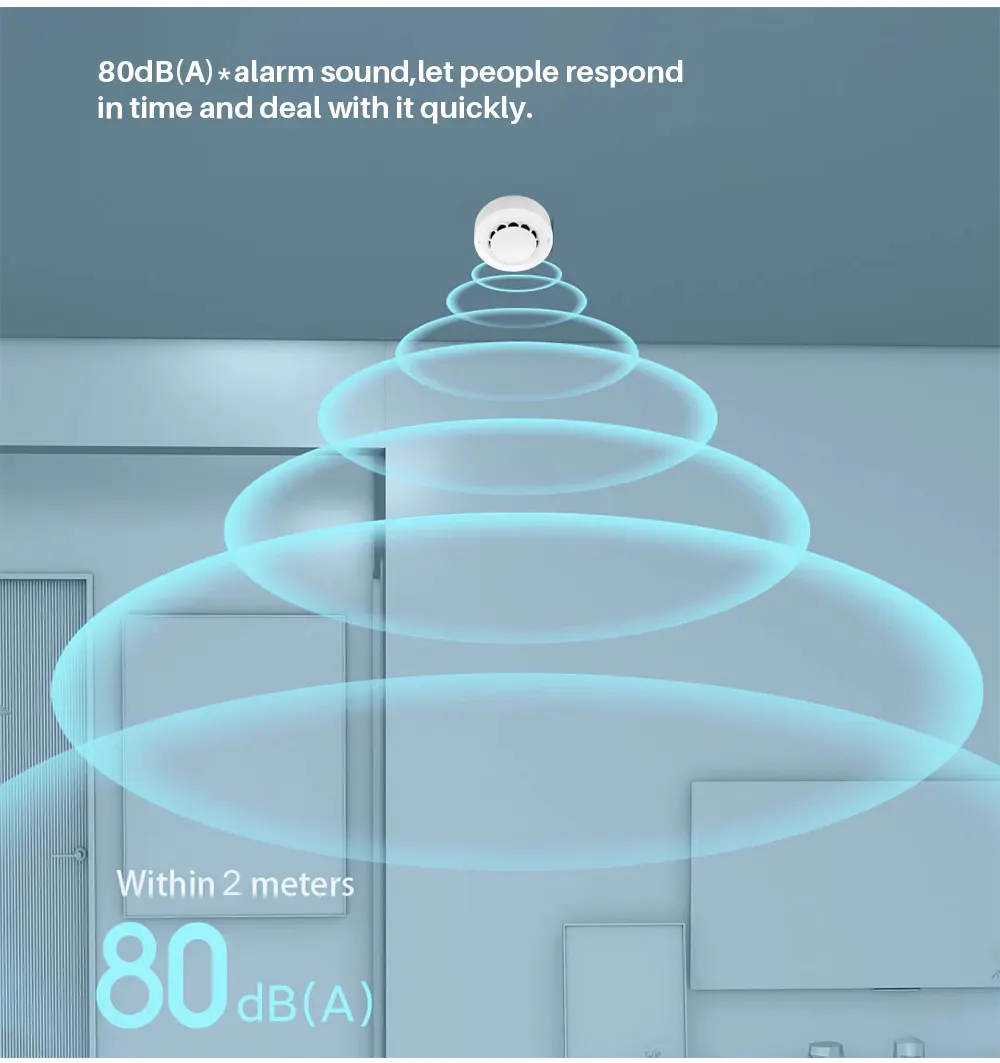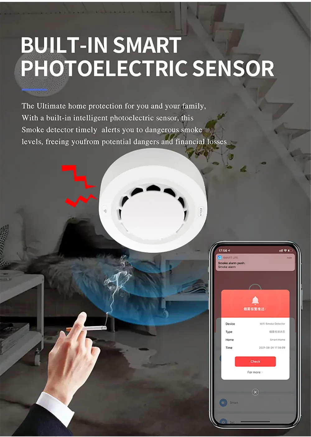 Этот продукт является умным WiFi фотоэлектрическим датчиком дыма. Он способен в режиме реального времени обнаруживать наличие дыма. После обнаружения опасности пожарного дыма, красный светодиодный датчик включится, и тревога предупредит вас и вашу семью своевременно. Его можно широко использовать в домашних условиях, в гостиной, в доме coggee, в танцевальном зале и в любых других местах, где требуется мониторинг пожарной сигнализации. (Такой датчик не может обнаруживать газ/тепло/огонь.)