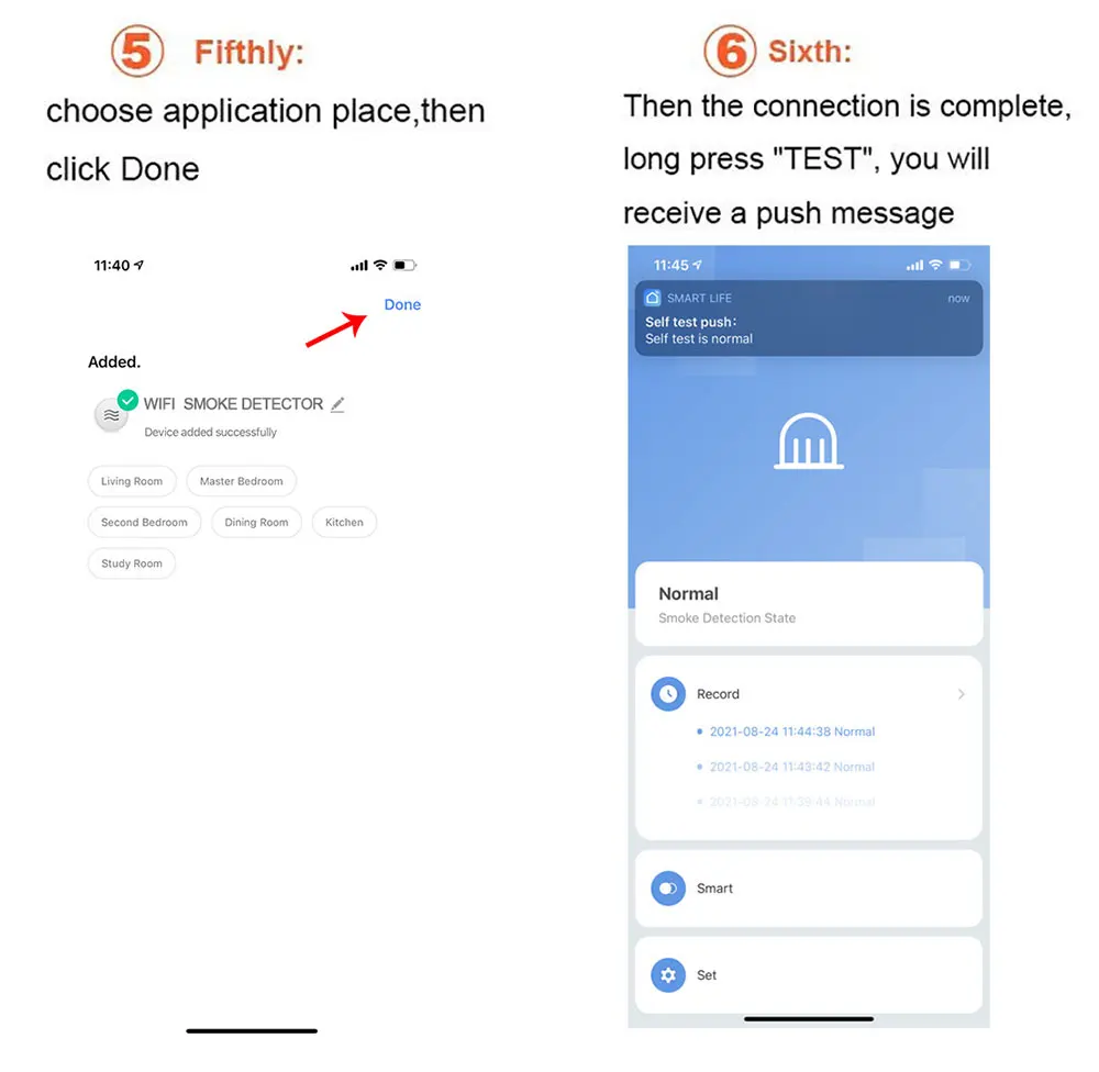 Когда дымовая сигнализация обнаруживает дым, она будет нажимать информацию на телефон через приложение около 5 секунд.