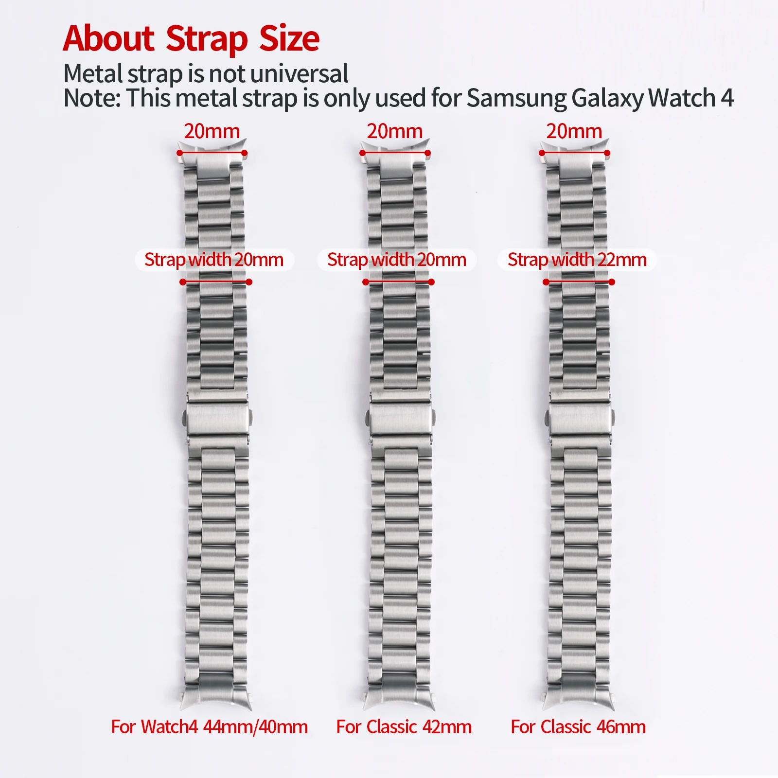 1. Модель: для Samsung Galaxy Watch 4 44 мм 40 мм/Galaxy Watch 4 Classic 42 мм 46 мм 2. Размеры в наличии: подходит 5,7 "-8,0" на запястье. Поставляется с инструментом для удаления звеньев, который делает ленту настолько легкой для регулировки, чтобы соответствовать вашему запястью. 3. Простота установки: поставляется с быстроразъемными пружинными штифтами. Надежно зафиксируйте часы, их легко собрать и снять 4. Отсутствие зазоров и высокое качество: отсутствие зазоров делают умные часы более модными. 5. Посылка включает в себя: 1 металлический ремешок для часов (не включая часы) 1x инструмент регулировки (бесплатный подарок не поддерживает послепродажное обслуживание)