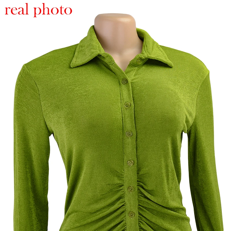 Однобортное зеленое вечернее платье-рубашка, женское Плиссированное мини-платье с лацканами, Осеннее женское платье с длинным рукавом