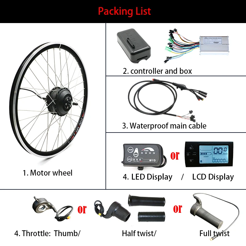 Упаковочный лист1. Моторное колесо36V 250W (передний мотор/задний мотор)2. Дисплей (светодиодный дисплей/ЖК-дисплей)3. Е-байка 36В 250 Вт контроллер4. Блок контроллера5. Водонепроницаемый основной кабель6. Дроссельная заслонка: дроссельная заслонка большого пальца/половина закрутки/полный поворот