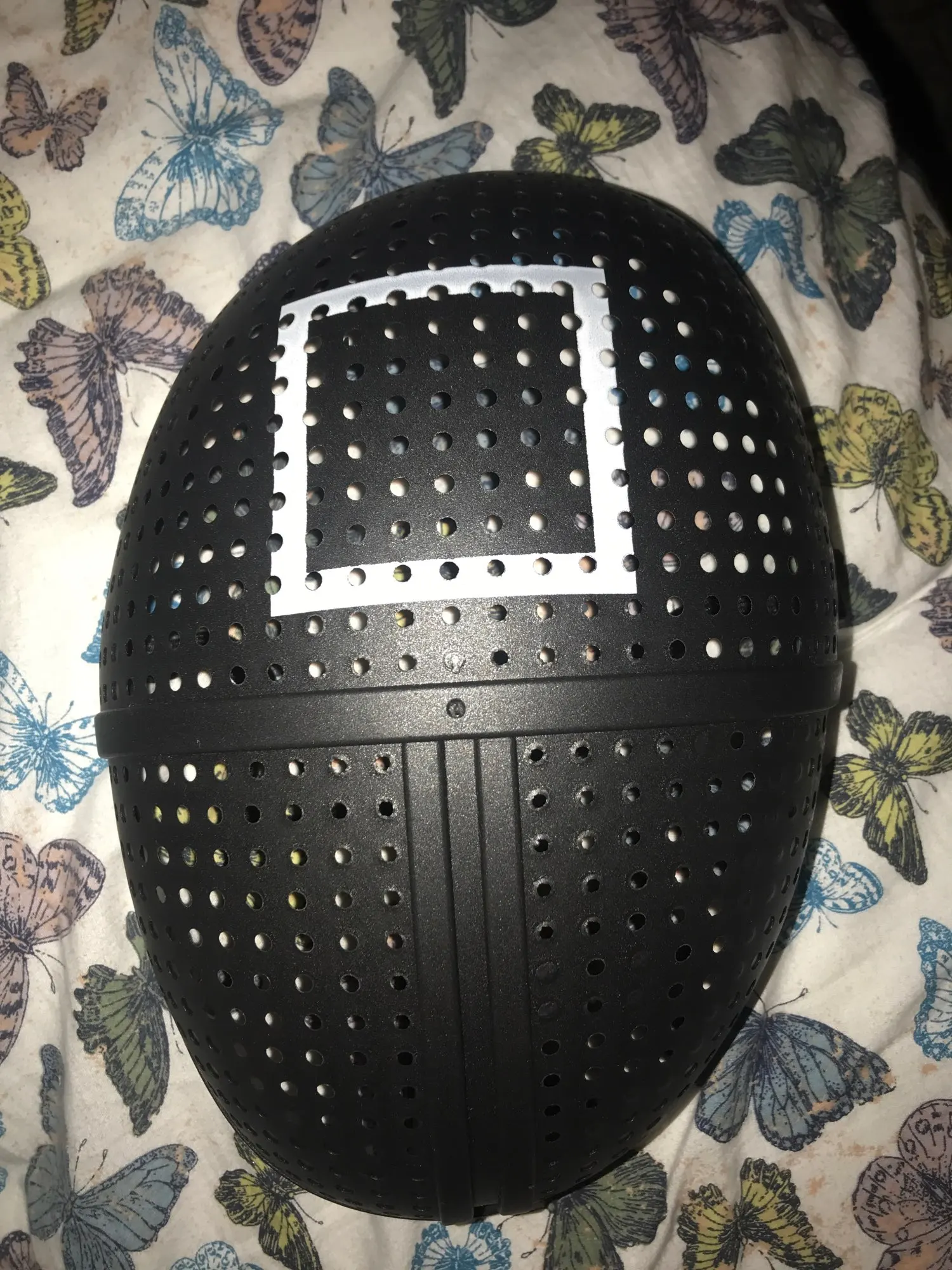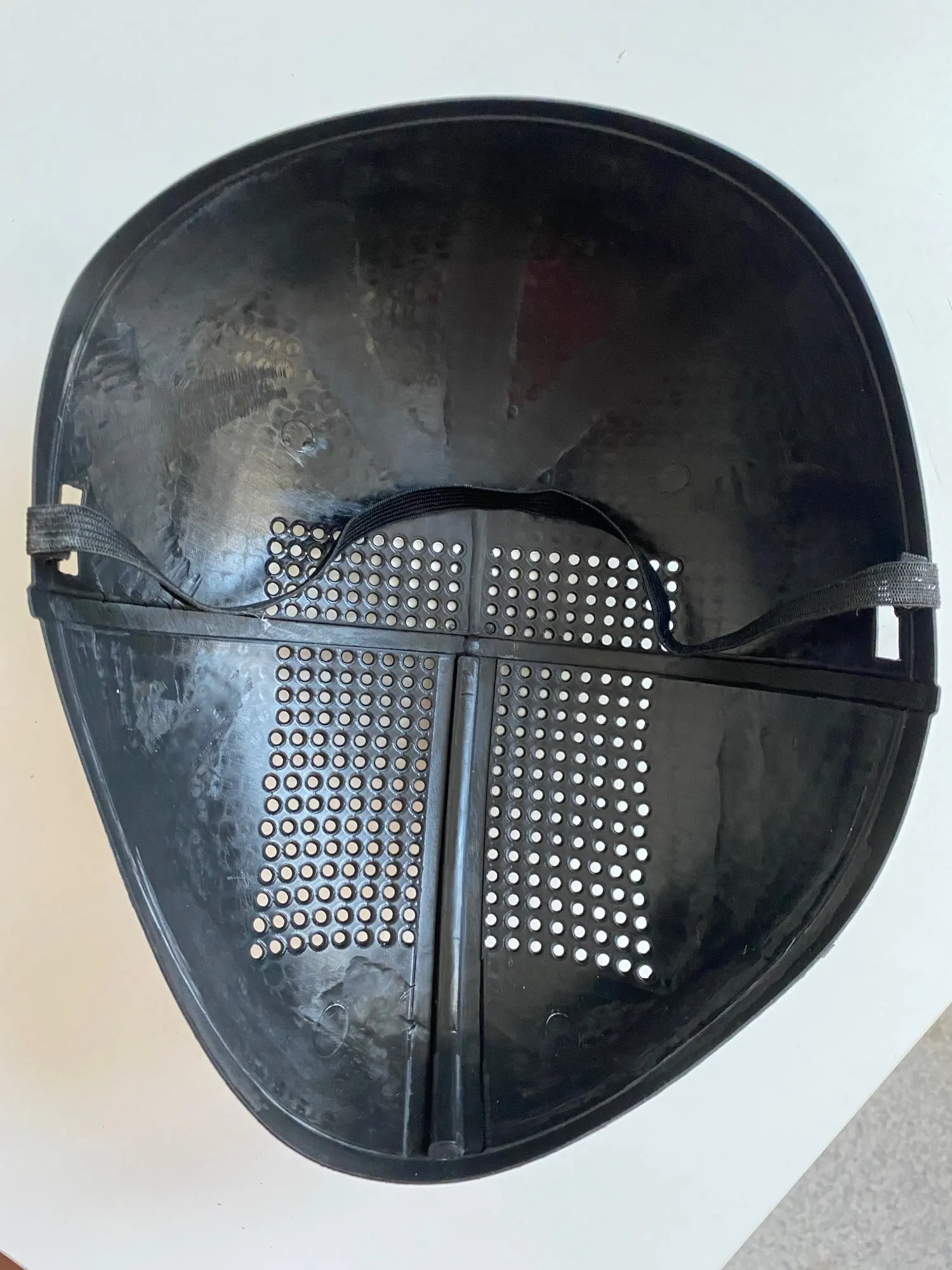 Жесткая форма ,сетка на глазах,отверстия для носопырок и ротика. Запах пластика.