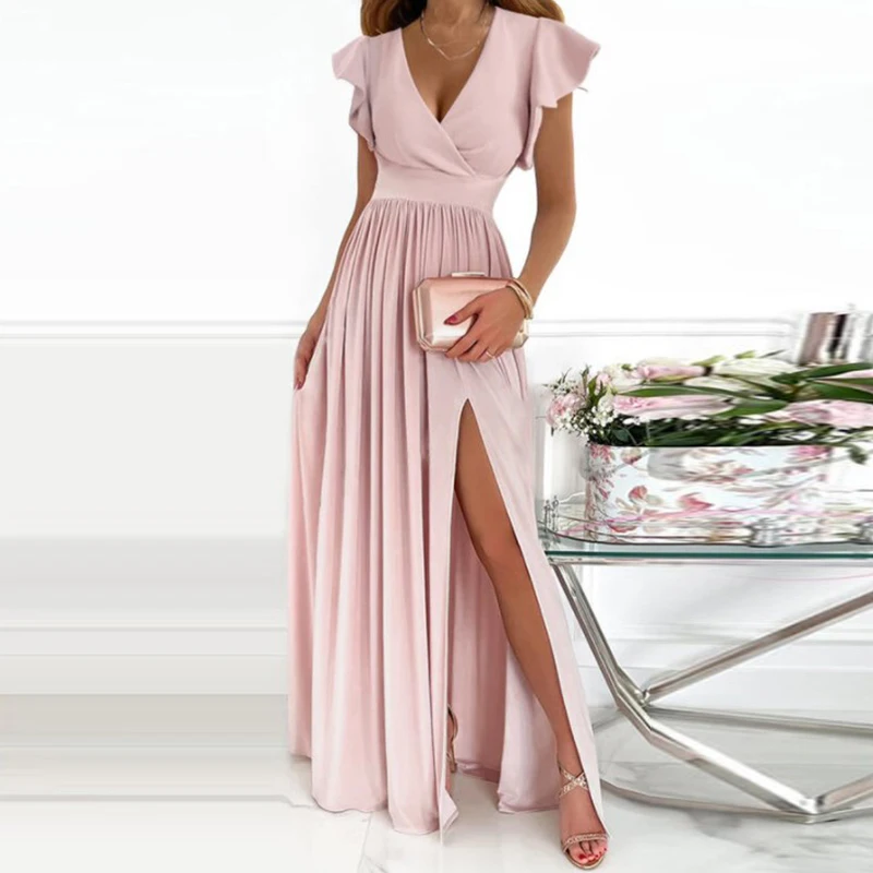 Модное Плиссированное сексуальное кружевное вечернее платье с V-образным вырезом, женские длинные платья без рукавов с высоким разрезом, женское офисное элегантное платье макси на молнии сзади