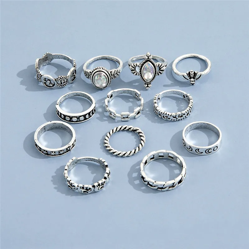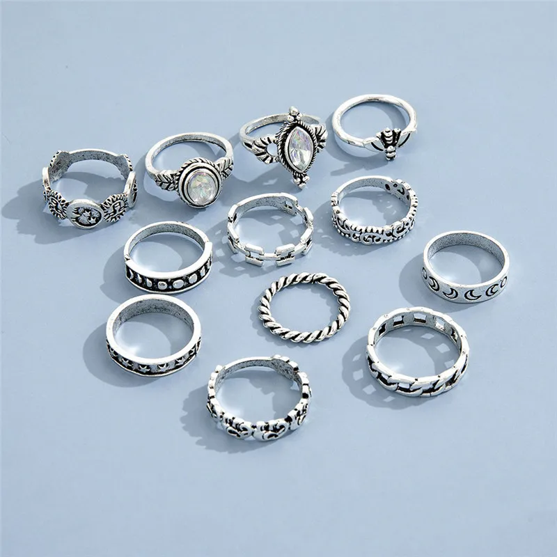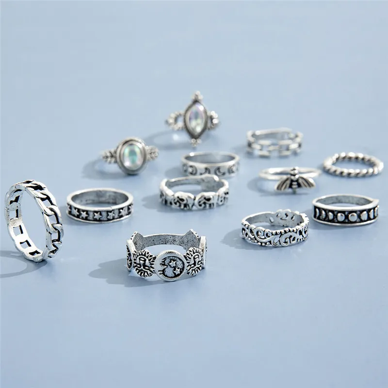 Набор Колец-миди LETAPI 12 шт.компл. в богемном стиле серебряного цвета с кристаллами, солнцем, луной, львом, слоном, кункулле для женщин, геометрические украшения