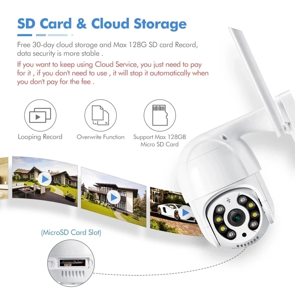 Поддержка двух режимов записи: 30 дней бесплатного облачного хранения, максимальная запись sd-карты на 128 ГБ, безопасность данных более стабильна;