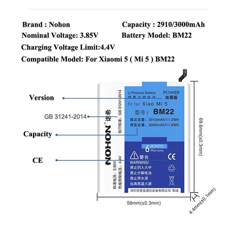 Capacity 3For Xiaomi 5 ( Mi 5 ) BM22 : 2910 mAh ~ 3000 mAh