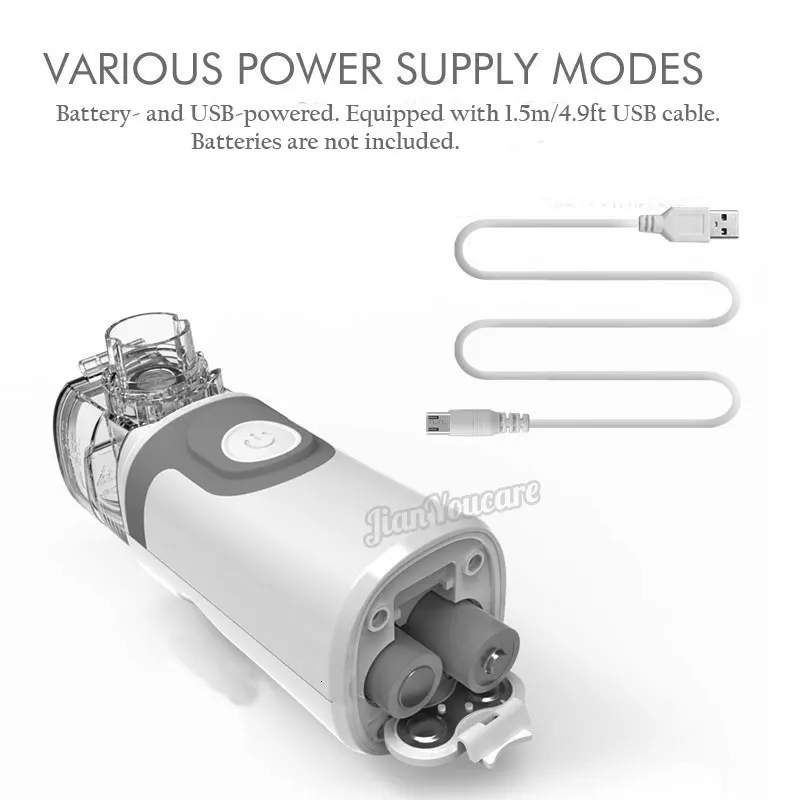 Название бренда: JianYouCareПроисхождение: КитайСертификация: CEЦвет: темно-синий или серыйРазмеры: 14,0 × 11,0 × 6,0 см/5,5 × 4,3 × 2.3inПригодность: для всех возрастовВес: прибл. 99 г/3,4 ozМощность: прибл. 2 ВтВходное питание: 5 В постоянного тока или 2 батарейки типа ААРаспыления скорость: ≥ 0,25 мл/мин.Распыленные частицы: ≤ 3,7 мкмКласс водонепроницаемости: IP22Максимальная температура воды: до 50 °C/122 °FМедицинская чашка ёмкость: 0,5 мл 10 мл/0,3 ozУровень шума: ≤ 50 дБUSB Длина шнура: 1,5 м/4.9ft