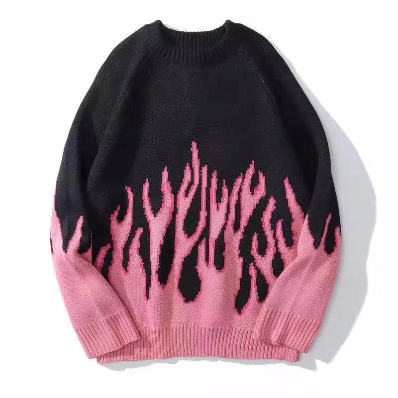 Свитер мужской в стиле Харадзюку, уличный ретро свитер с принтом в виде пламени, в стиле хип-хоп, из спандекса, с круглым вырезом, повседневный мужской и женский топ, на осень