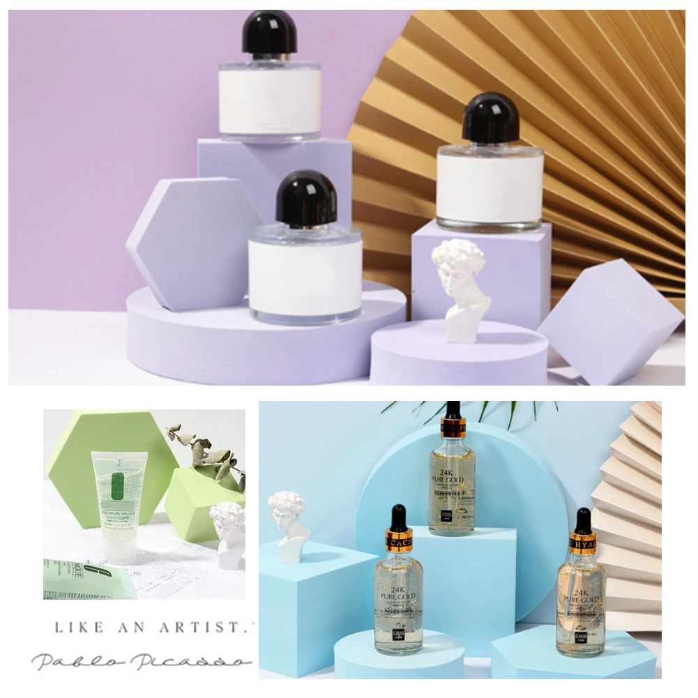 Всё кривое, углы кривые, стёсанные, грани неровные, при чем не одна грань из, допустим, шести, а 3, 4 из шести, соответственно не поставишь так, чтобы было в кадре видно 3 или 4 грани. Ещё они мягкие, не уверена, что выдержат тяжёлые флаконы и ничего не помнётся. Так что готовьтесь, кадры придётся фотошопить, а лучше тут не покупать.