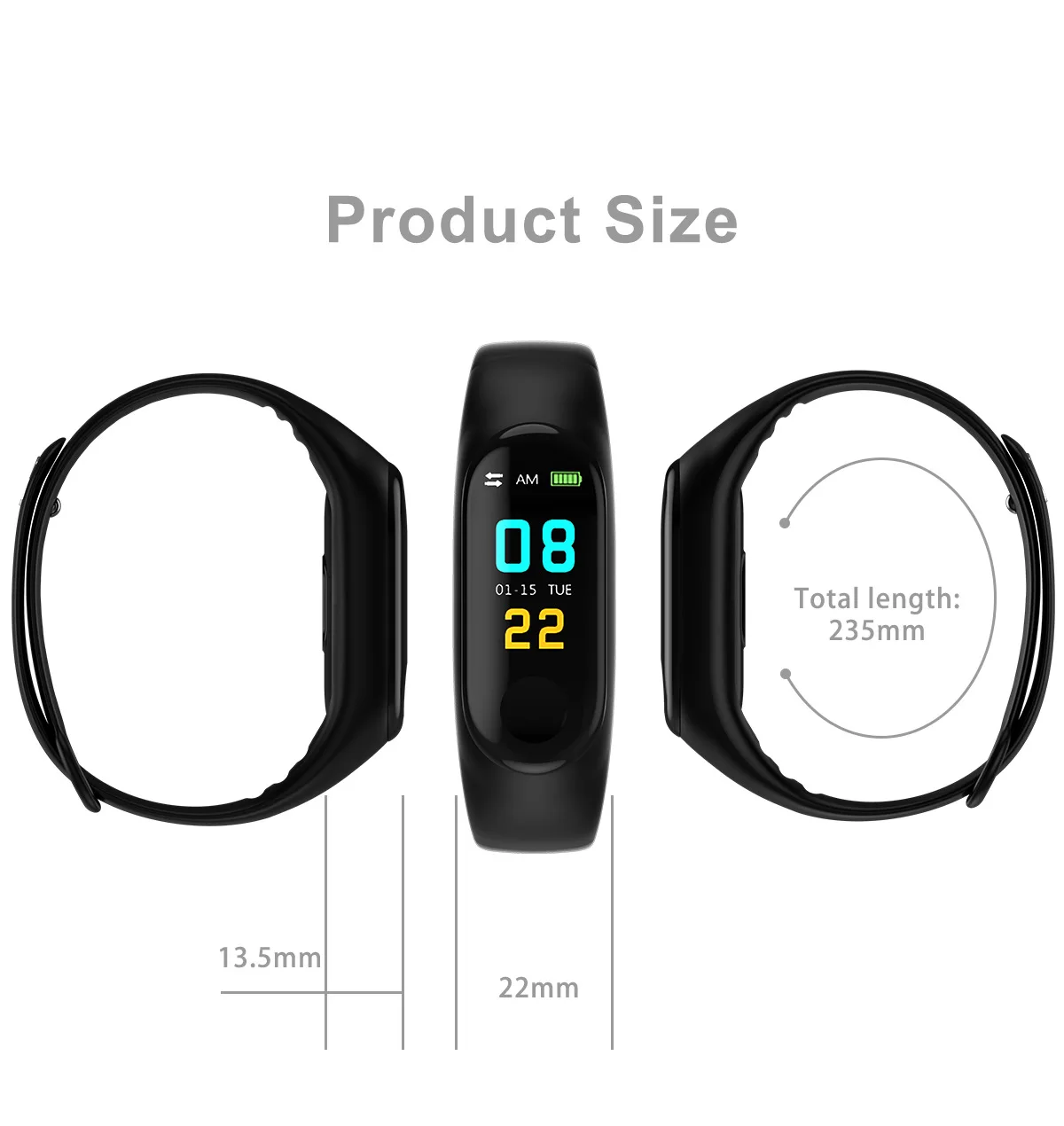 Напоминание:Если браслет не может быть запущен, пожалуйста, зарядите 5-10 мин перед использованием.Основные характеристики:1. Четкий дисплей: 0,96 дюймовый цветной дисплей с высоким разрешением2. Отображение параметров здоровья: этот умный браслет может четко отображать время, дату, шаги, расстояние и калории. Немедленно сообщите свои спортивные данные3. Монитор сердечного ритма: HRM функция монитора сердечного ритма даст вам отзывы в реальном времени, дайте вам знать о вашем пульсе в любое время и в любом месте4. Монитор сна: Вам интересно качество вашего сна? Функция монитора сна даст вам ответ5. Удаленная Камера: Управляйте смартфоном, чтобы брать телефоны на запястье6. Потребление калорий: Контролируйте свои упражнения и потребление калорий в любое время и в любом месте, отслеживая состояние дождя в любое время7. Сидение и питье напоминают: Когда вы сидите дольше, чем заданная продолжительность, часы будут напоминать вам вибрацией или кольцом, что пришло время для упражнений и питья8. Будильник: Настройка будильника на телефоне, часы будут напоминать вам вибрацией9. Язык приложения: русский, немецкий, итальянский, японский, французский, упрощенный китайский, традиционный китайский, португальский, испанский, арабский, корейскийХарактеристики:Тип: умные часыКоличество: 1 шт.Чехол Материал: АБС-пластик, поликарбонатМатериал ремешка: TPEЦвет: черный/синий/красный/темно-синийЕмкость аккумулятора: литий-ионный аккумулятор 90 мАчРазмер экрана: экран 0,96 дюймаВремя работы в режиме ожидания: 10 - 25 днейВремя зарядки: около 2 часовРазмер изделия: 26x1,9x1,1 смПосылка Размеры: 12x5x1,8 смВес нетто: 53 гПосылка:1 * умный Браслет1 * зарядный кабель1 * Руководство пользователя