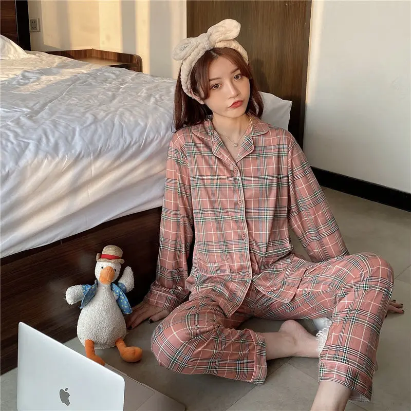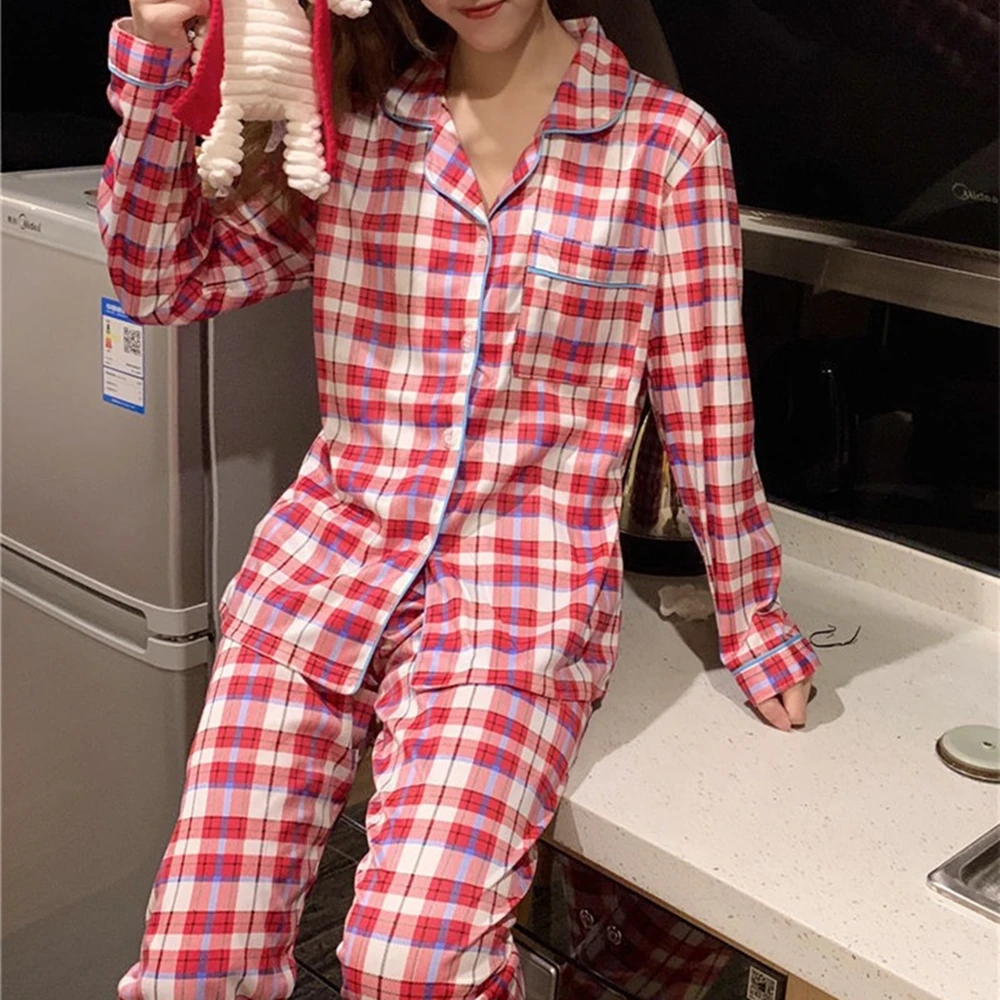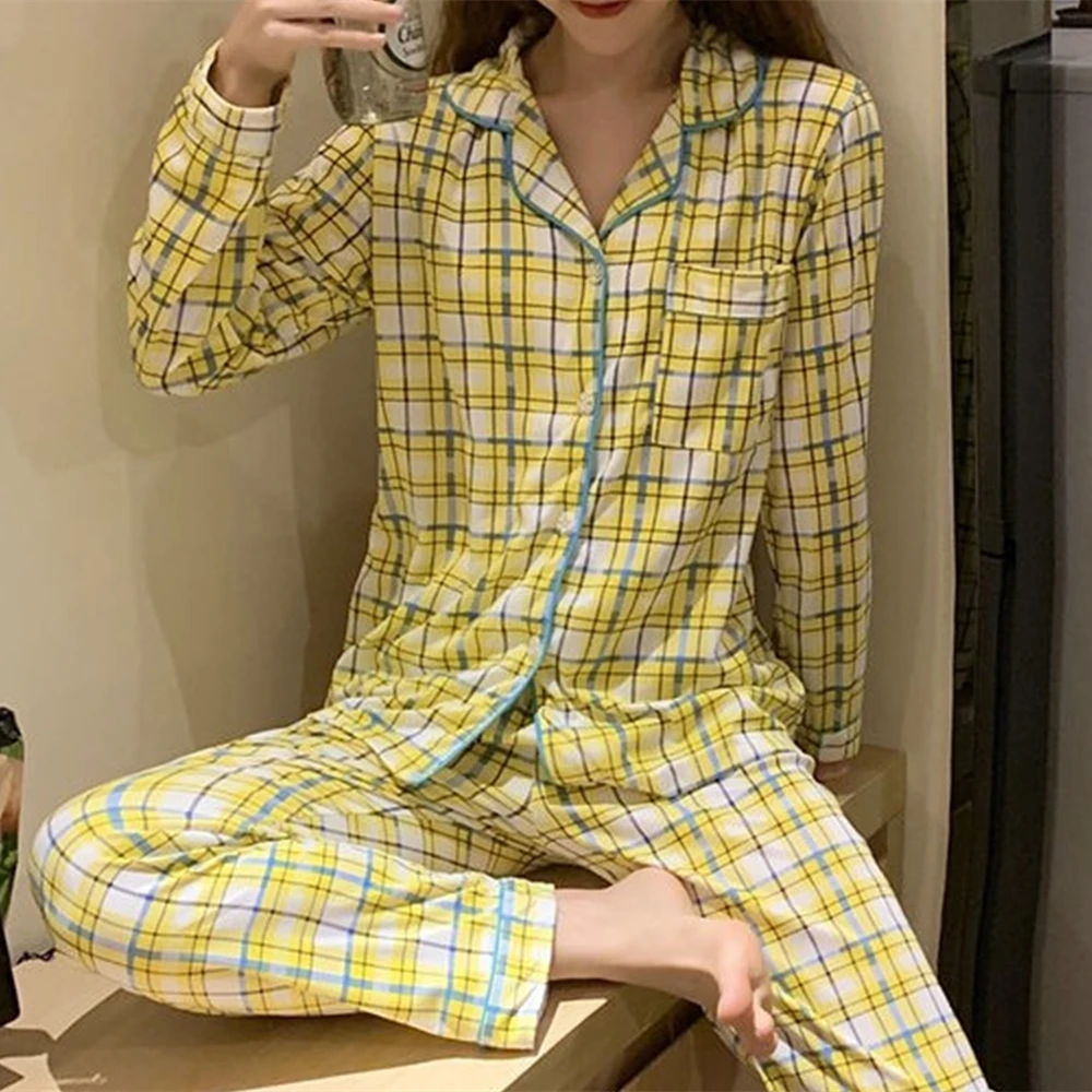 Пижама с лацканами для женщин, пижамный комплект в клетку, женская простая Пижама, костюм с длинным рукавом, женская мягкая одежда для сна, осень, 2 предмета, домашняя одежда, 2021