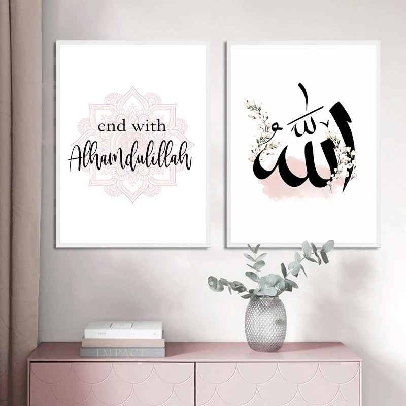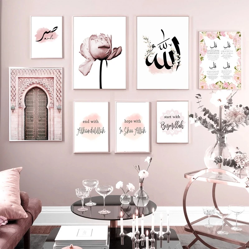 Картина на холсте, мусульманская Настенная роспись, мусульманский плакат, арабский розовый цветочный принт, подвесная картина, Современная минималистская мечеть.