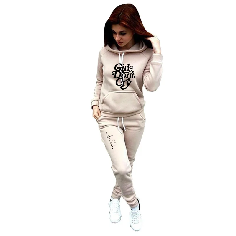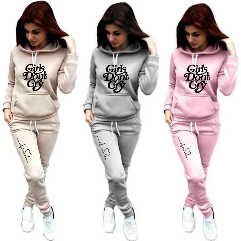 Новинка 2021, женский спортивный костюм из 2 предметов, толстовки с капюшоном, модный однотонный спортивный костюм с принтом, Теплые повседневные женские комплекты