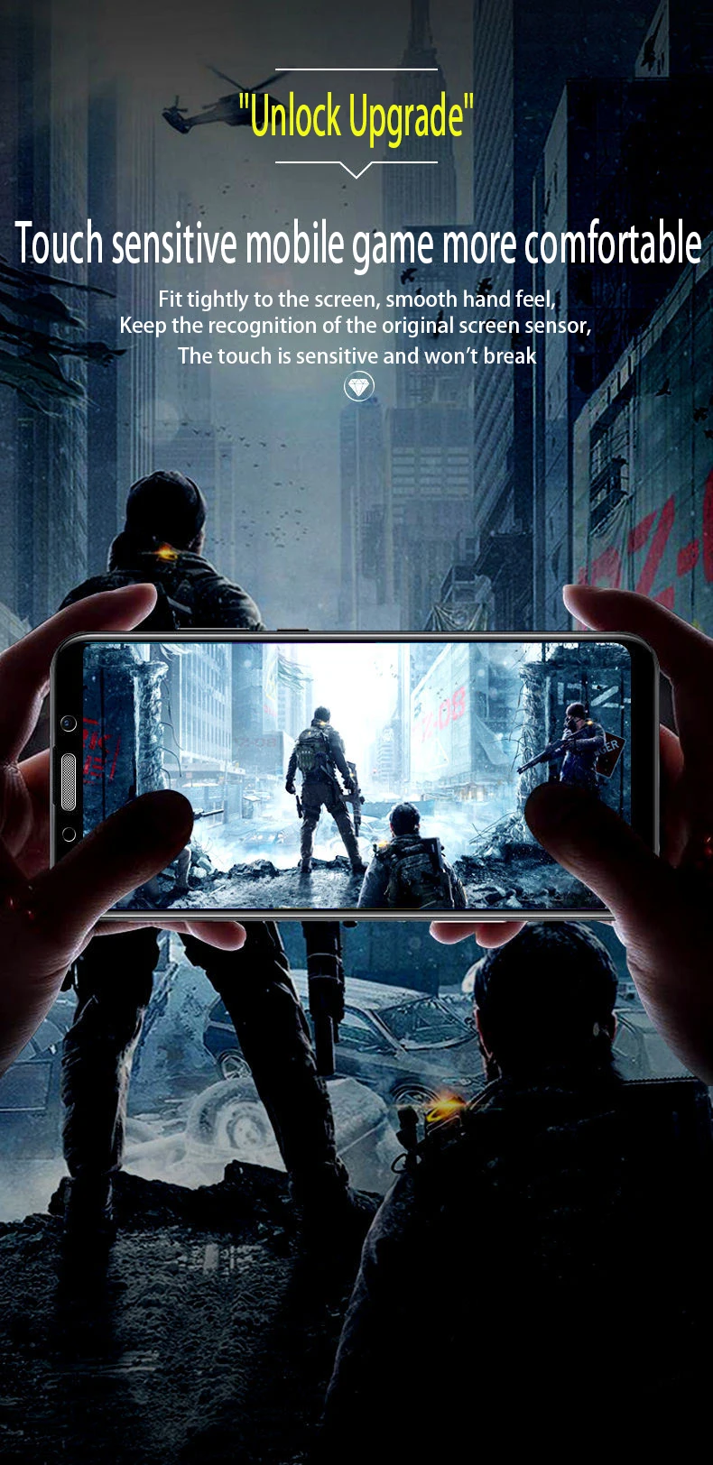 Сенсорная сенсорная мобильная игра более удобнаяПлотно прилегает к экрану, гладкая на ощупьСохраняйте распознавание оригинального сенсора экрана, сенсорный экран чувствителен и не сломается