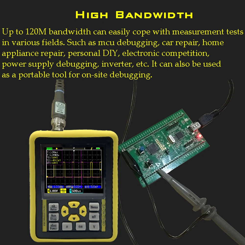 Это своего рода качественный осциллограф с пропускной способностью 120 м и частотой дискретизации 500 м, более стабильный и с более высокими осадками. 14 доступных вариантов измерения, частота, пики-пики, рабочий цикл, амплитуда, RMS, средняя, период, + ширина импульса,-ширина импульса, Макс, мин, верх, основание,-Рабочий цикл. Поддержка переключателя выходного сигнала: Синусоидальная волна, квадратная волна, треугольная волна и т. д. Широкое применение на mcu отладки, ремонт автомобилей, Ремонт бытовой техники, DIY электронная конкуренция, отладка питания, инвертор и т. Д. Вы можете попробовать. Особенности: Разрешение:Оснащен цветным дисплеем с разрешением 320*240, с яркими цветами и высокой контрастностью, вы можете четко видеть данные. Пропускная способность и частота выборки:С пропускной способностью 120 м и частотой дискретизации 500 м, более стабильной и с более высокими осадками. Высокая пропускная способность:Полоса пропускания до 120 м может легко справиться с измерительными тестами в различных областях. Доступно 14 вариантов измерения:Частота, пики-пики, рабочий цикл, амплитуда, RMS, средняя, период, + ширина импульса,-ширина импульса, Макс, мин, верх, основание,-рабочий цикл. Поддержка переключателя выходного сигнала: Синусоидальная волна, квадратная волна, треугольная волна и т. д. FFT:FFT используется для преобразования сигналов временной области в частотную область и широко используется в гармоническом анализа и других областях.Поддержка трех режимов отображения:Логарифмический, линейный и музыкальный спектр. Справочная форма сигнала:Вы можете измерить форму волны, зафиксировать форму тока на экране, и нормально обновленная Форма волны не будет зависеть. Эталонные формы сигнала полезны для одноканальных осциллографов. С эталонными волноводами вы можете легко сравнить формы сигналов двух каналов. Полный триггер:Режим Trig: автоматический/нормальный; Тип триггера: подъем/падение, уровень триггера: Руководство/Авто Вертикальная чувствительность и время основания:Вертикальная чувствительность области варьируется от 10 мВ/див до 10 В/див (1 диапазон). Временная база осциллографа составляет от 5 до 10 с. Сохранение формы волны:Один щелчок для сохранения формы сигнала экрана, а также поддержка удаления или просмотра скриншотов истории .. Подключение к ПК:Изображения скриншота могут быть экспортированы на компьютеры через usb-соединение. Видеовыход:3,5 мм для наушников внизу может выход AV видео Имитации Сигнала, который может быть подключен к ТВ или проектору. Источник питания:Встроенная перезаряжаемая литиевая батарея, 3,7 V, 3000mAh большой caparity, полностью заряжено может обеспечить длительное время работы. Компактный размер:Легкий и портативный, также может использоваться в качестве портативного инструмента для отладки на месте. Широкое применение:Подходит для mcu отладки, ремонта автомобилей, ремонта бытовой техники, DIY электронных соревнований, отладки питания, инвертора и т. д. Характеристики: Название: осциллограф Модель: DSO1511G Цвет: желтый, зеленый(Опционально) Батарея: 1*2,5 V, 3000 мА/ч, Батарея(В комплекте) Каналы: 1 Экран Размер: 2,4 дюймов Измерение: 14 типов Разрешение: 320*240 Полоса пропускания: 120 м Частота дискретизации: 500 м Время подъема: <3ns Глубина хранения: 128 кбит Сопротивление: 1MΩ База времени: 5ns-10s Чувствительность вер: 10 мВ/div-10V/Див Максималь