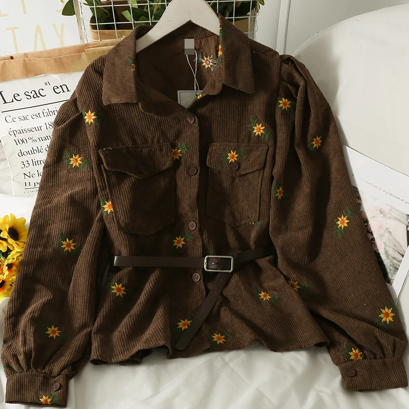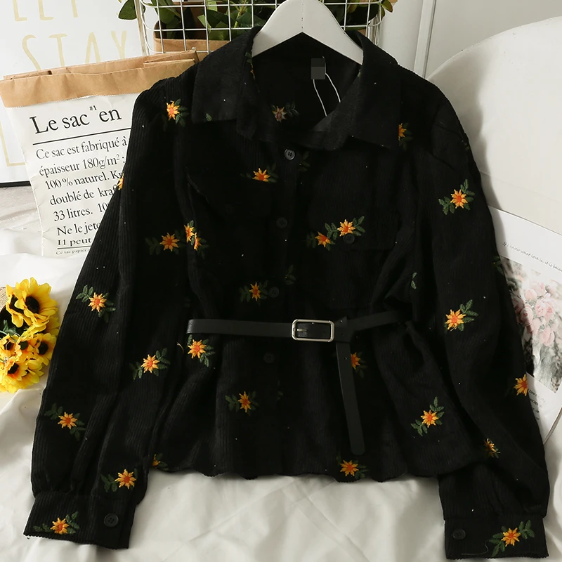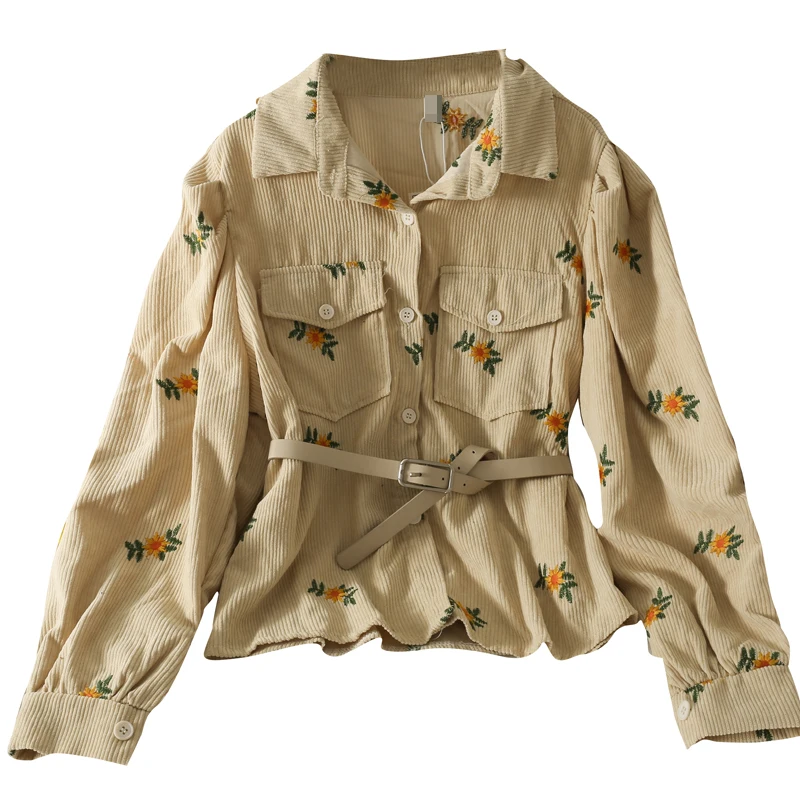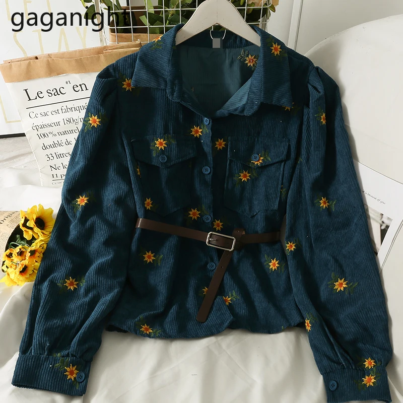 Gaganight Женская Вельветовая однобортная рубашка с длинным рукавом, Новинка осени 2021, бандажная облегающая блузка с высокой талией и вышивкой