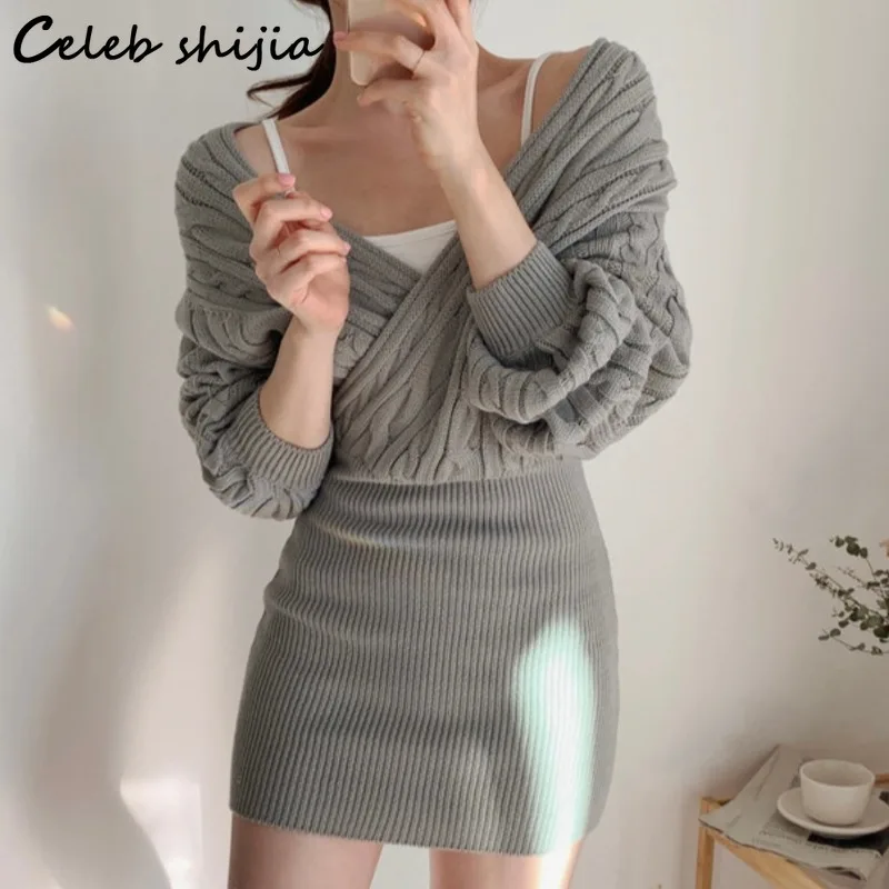 Женское вязаное платье-свитер SHIJIA, элегантное винтажное свободно...