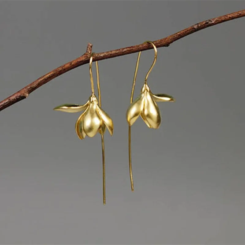 Модные золотые металлические серьги в виде цветка магнолии, шикарные украшения, лепестки лотоса, длинные серьги с крючком для женщин, аксессуары