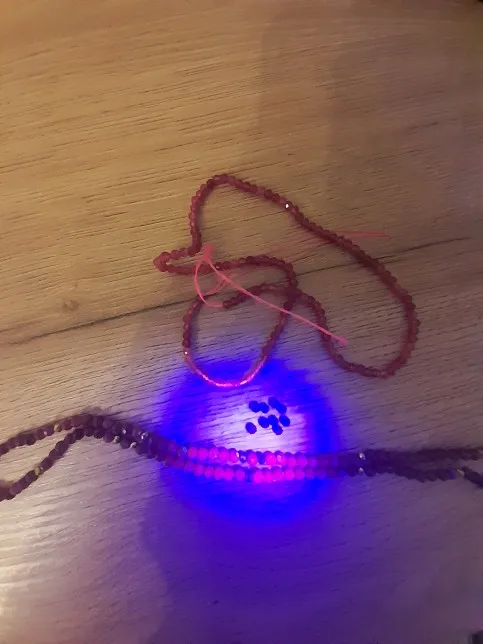 Это не натуральный (или даже синтетический) Рубин. Как вы видите, они не отражаются при УФ-свете! Ниже вы можете увидеть: мое ожерелье изготовлено из натурального каучука (они отражаются!) и камней от продавца (только нити отражаются, но не камни!). Продавец ofc не хочет признавать, что это подделка, не хочет принимать мое восстановление.