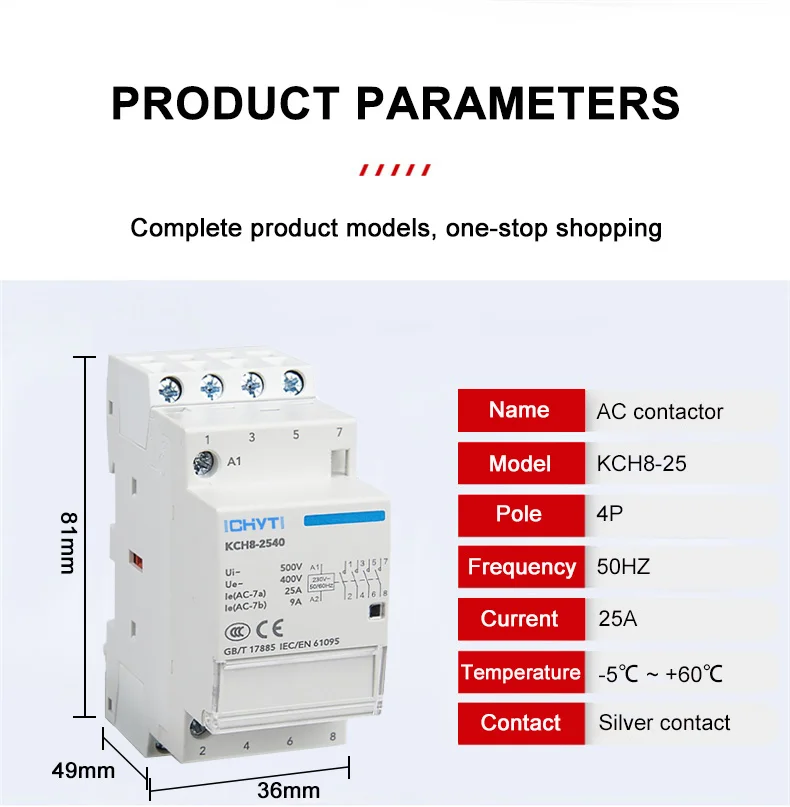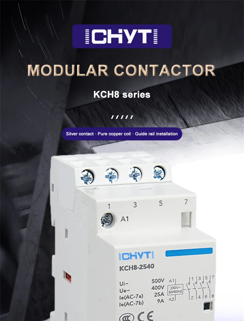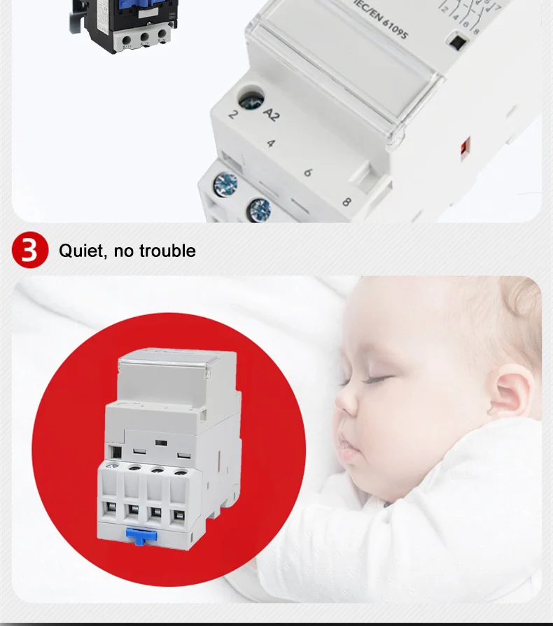 AC контактор для дома-это в основном предназначены для переменного тока 50 Гц или 60 Гц цепей с 230/400V. Номинальное рабочее напряжение при AC-7a использовании, Номинальное рабочее напряжение до 230 В, номинальный рабочий ток до 63А, Номинальное рабочее напряжение в использовании AC-7b, номинальный ток до 20А. Использование в разрыве мощности ниже 6kA цепи. Для расстояния подключения или прерывания цепи.Применение: для дома, квартиры, отеля, автоматическое отключение или подключение питания.Нормальные условия работы и установки:1. Температура окружающей среды: от-5 °C до + 40 °C, средняя температура не более + 35 °C в течение 24 часов.2. Высота: не более 2000 м.3. Атмосферные условия: относительная влажность места установки должна быть не более 50%, когда максимальная температура + 40 °C: Если при более низкой температуре допускается более высокая относительная влажность. Среднемесячная минимальная температура в Самый влажный месяц не должна превышать + 25 °C и среднемесячная максимальная относительная влажность в этом месяце не более 90%. Кроме того, следует учитывать росы на поверхности продуктов, вызванные изменением температуры.4. Класс загрязнения: класс 2.5. Условия установки: класс II.Инструкция по применению1. Проверьте, соответствует ли контактор объему применения и условиям работы перед установкой2. Во время установки выньте компонент остановки движения и поставьте контактор на безопасную орбиту, а затем Поднимите компонент остановки движения, чтобы зафиксировать контактор на безопасной орбите, чтобы избежать ослабления и падения компонент остановки движения, если вы хотите удалить контактор.ПредостережениеA) убедитесь в правильном режиме подключенияB). Закрутите винт во время соединения