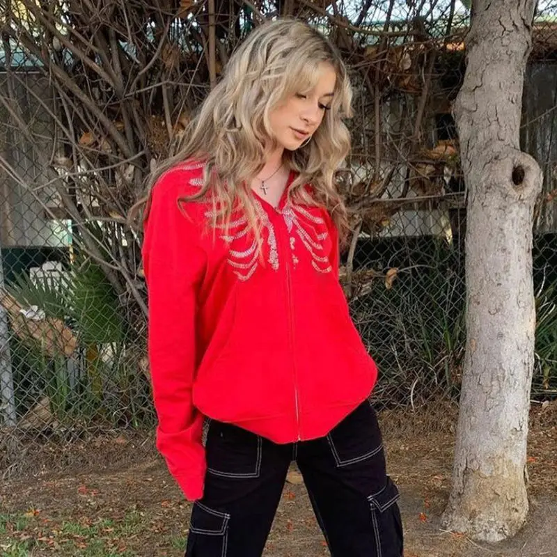Y2K Стразы толстовки со скелетом на молнии женские толстовки оверса...