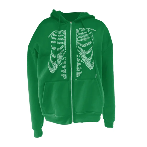 Стразы, худи в стиле ретро, американский готический стиль, с принтом скелета, большие размеры, на молнии, зеленый Y2K, осенне-зимний Женский свитшот
