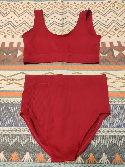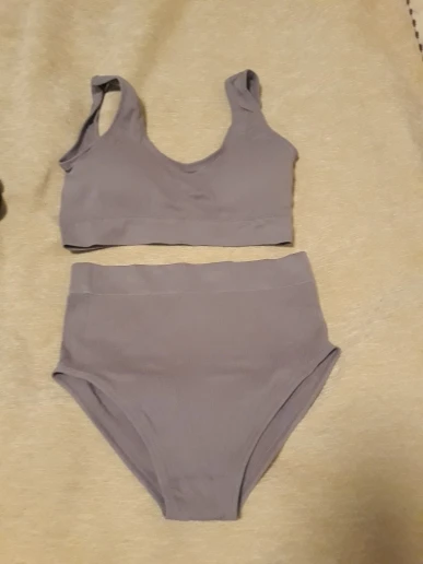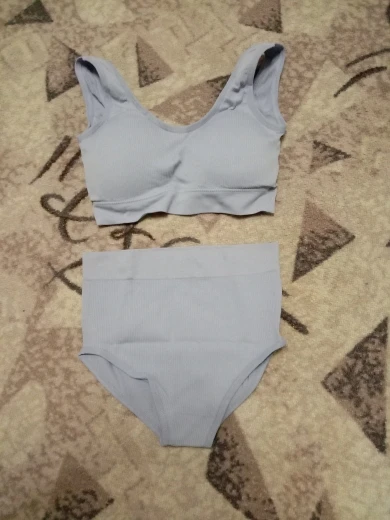заказ отправили не сразу, но пришел достаточно быстро, за три недели до Ижевска. Комплект приятный, пошит хорошо. Ткань синтетика дышащая и тянущаяся, поэтому легко садится как на 36 кг дочки, так и на мои 50 кг. В трусиках хлопковая ластовица, посадка высокая, легкая утяжка. В топе при желании вкладыши снимаются,тк материал тянется, то особо грудь не держит. Дочка просит ещё такой комплект, ей нравится, а я сделала вывод, что мне хлопок приятнее.