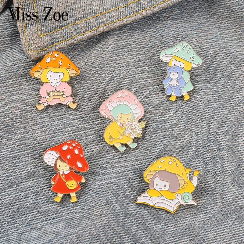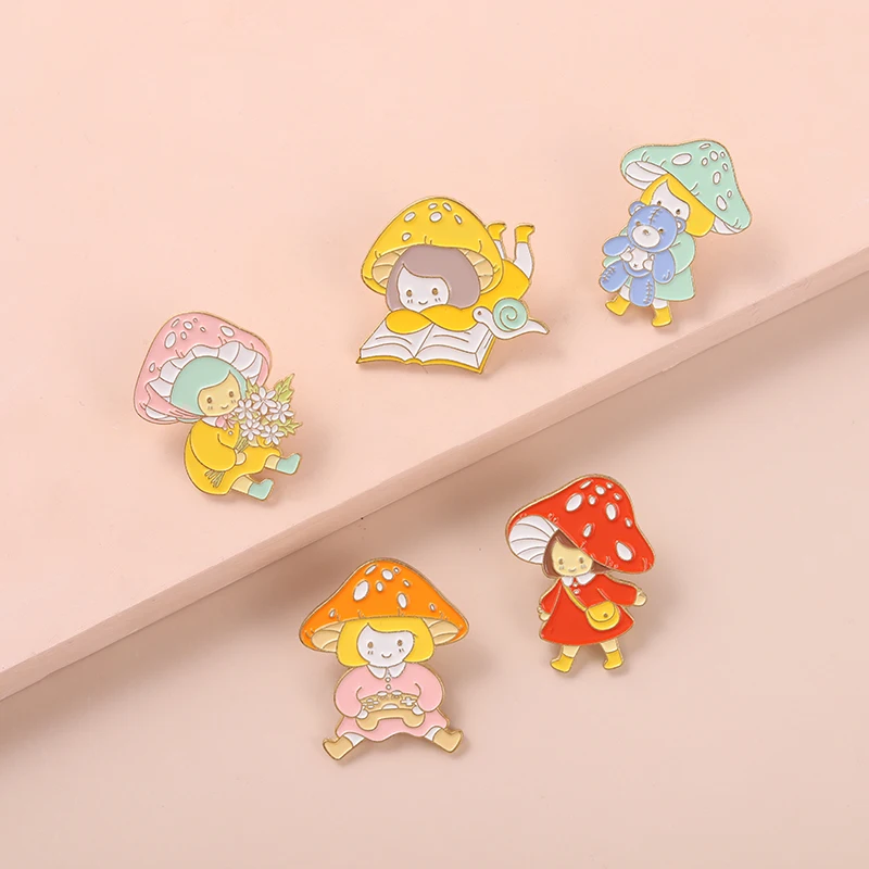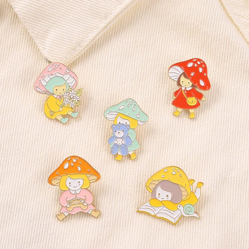 Эмалированные булавки в виде мультяшных грибов, милая маленькая дев...