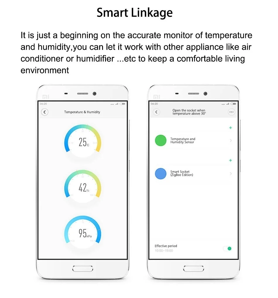 El sensor de humedad y temperatura Aqara puede controlar la temperatura, la humedad y la presión atmosférica, y puede hacer cambios en el entorno enviando una notificación a su teléfono trava. Con la capacidad de combinar con otros dispositivos inteligentes Xiaomi como el control remoto de la puerta de enlace, el enchufe inteligente, el controlador versatil, este sensor es capaz de ayudarte a crear un hogar inteligente. Датчик inteligente es fagil de controlar el cambio de temperatura y humedad viendo los datos de acuerdo con los registros históricos.