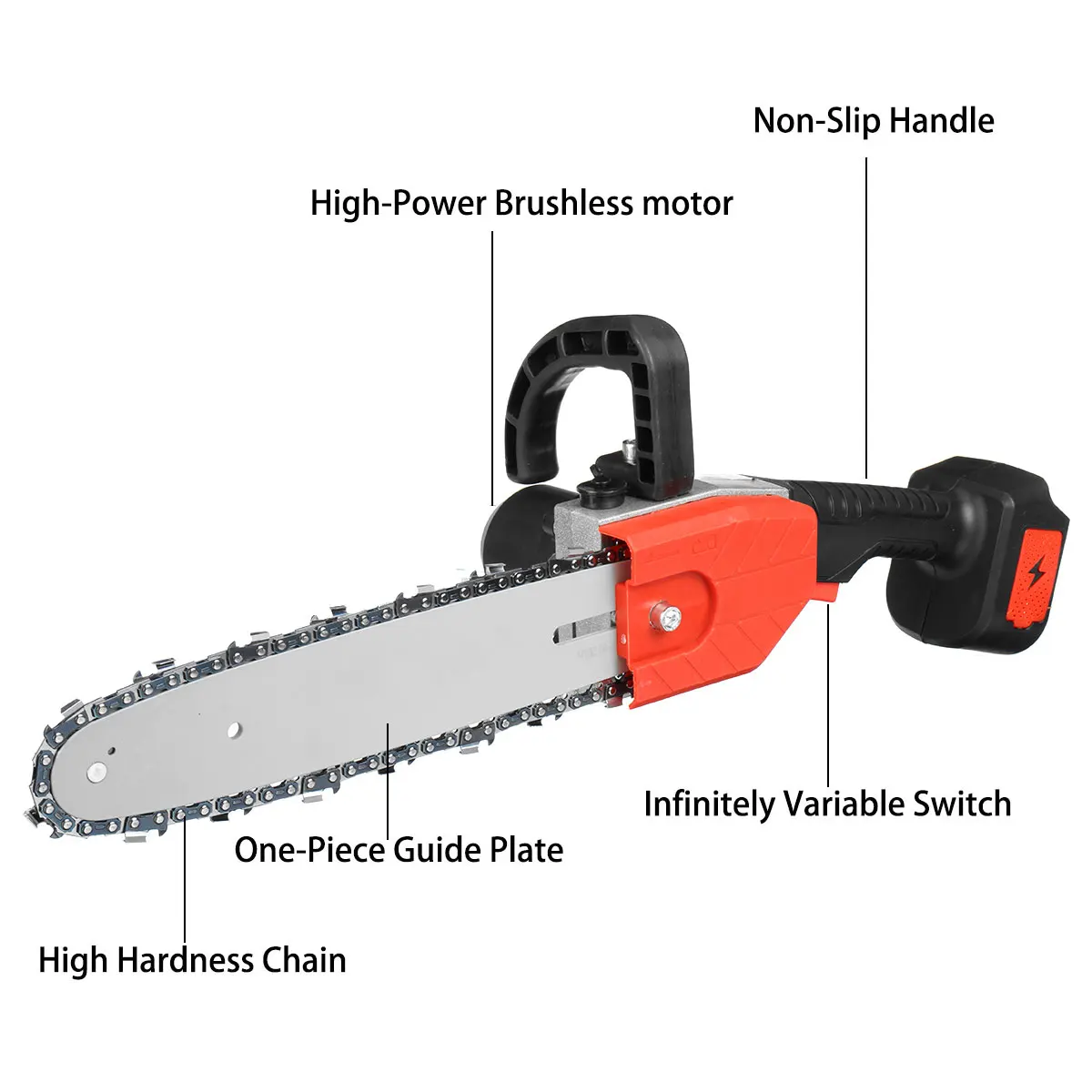 Особенности:-Эргономичная ручка, которая очень удобна и безопасна для переноски.-Безопасность пилы, эффективно повышает эффективность вашей работы.-- Цепи пилы были закалки, закалки и отжига. Он прочен, чем обычные цепи пилы.-Маленький размер, можно держать одной рукой.-- Светильник вес тела, светильник и удобный, светильник вес конструкции, долгое время хранения и не устают руки.-- Двигатель из чистой меди, сильная мощность, быстрая резка, повышение эффективности.-Практичная, быстрая скорость, низкое энергопотребление.-Переключатель отличного качества, быстрая и медленная регулировка, плавное изменение скорости.