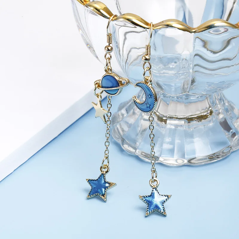 Женские асимметричные серьги-клипсы в Корейском стиле с эмалью и синими звездами Moon Planet Circle, вечерние серьги, подарок