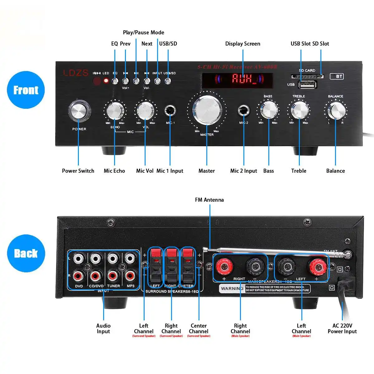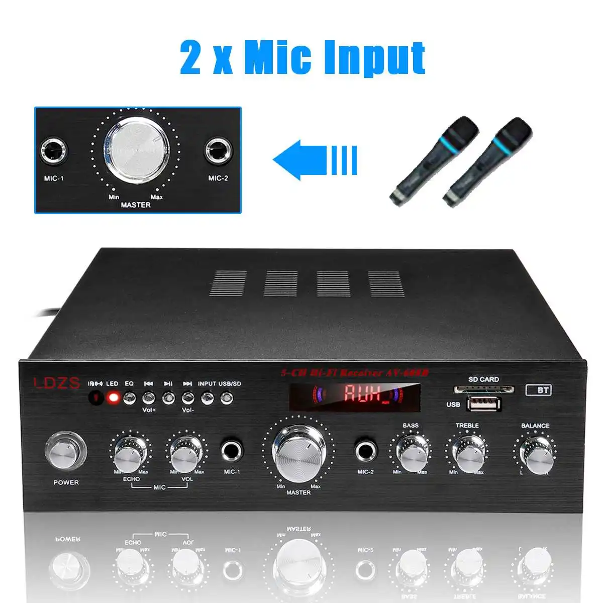 AV608 2000 Вт 5-канальный bluetooth Hi-Fi стереоусилитель, цифровой усилитель для караоке, усилитель аудио для домашнего кинотеатра, ревербератор, микрофон, FM, USB, SD