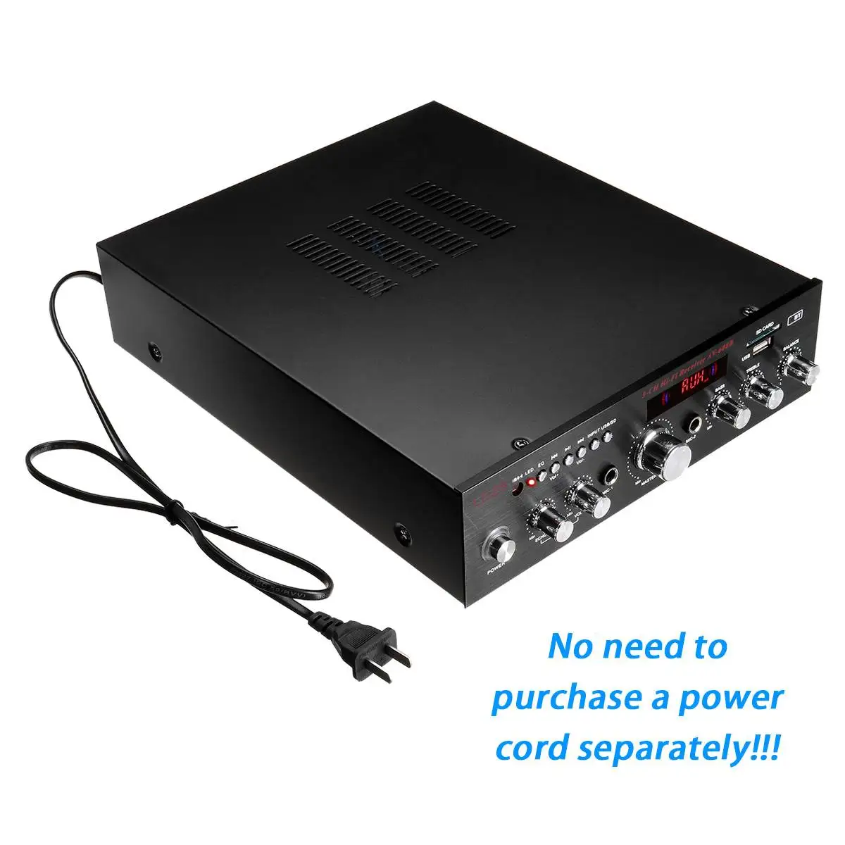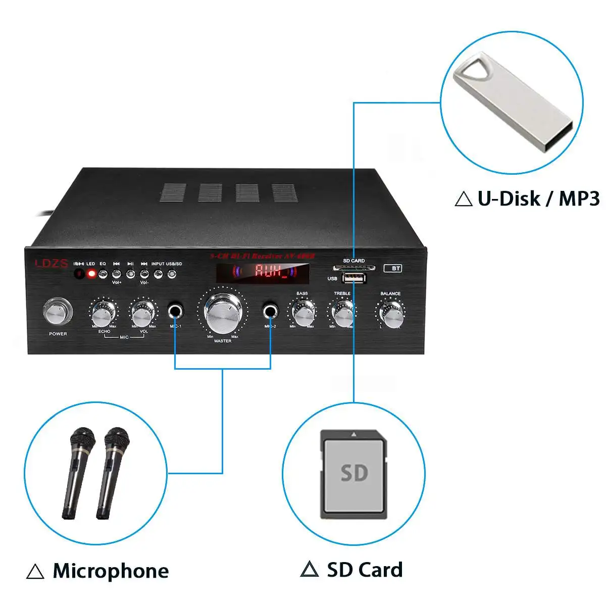 Особенности:-Мини HIFI Цифровой bluetooth аудио усилитель мощности.-Sd-карта, u-диск, воспроизведение формата MP3, Поддержка беспроводного подключения bluetooth.-Поддерживает fm-стерео радио.-Поддержка 2 way вход для микрофона.-С высокими частотами, басами и регулятором громкости, очень прост в использовании.-Низкое Искажение обеспечивает более четкий, сильный и мощный звук.-5 выходной канал.-Модернизированная Высокая мощность 2000 Вт.-С функцией дистанционного управления.-Питание постоянного/переменного тока, подходит для домашнего использования.-Подходит для HiFi, систем домашнего кинотеатра и караоке.