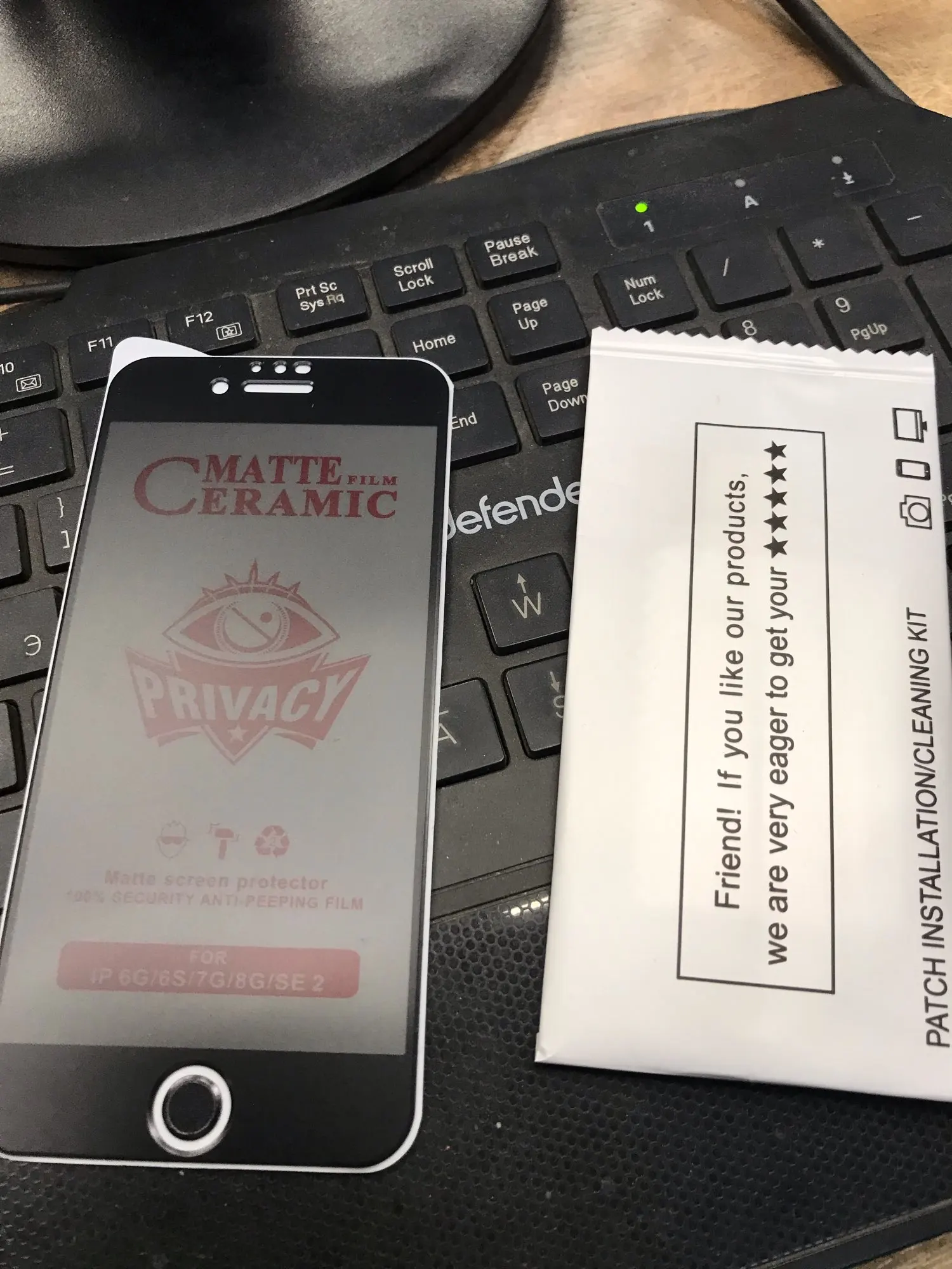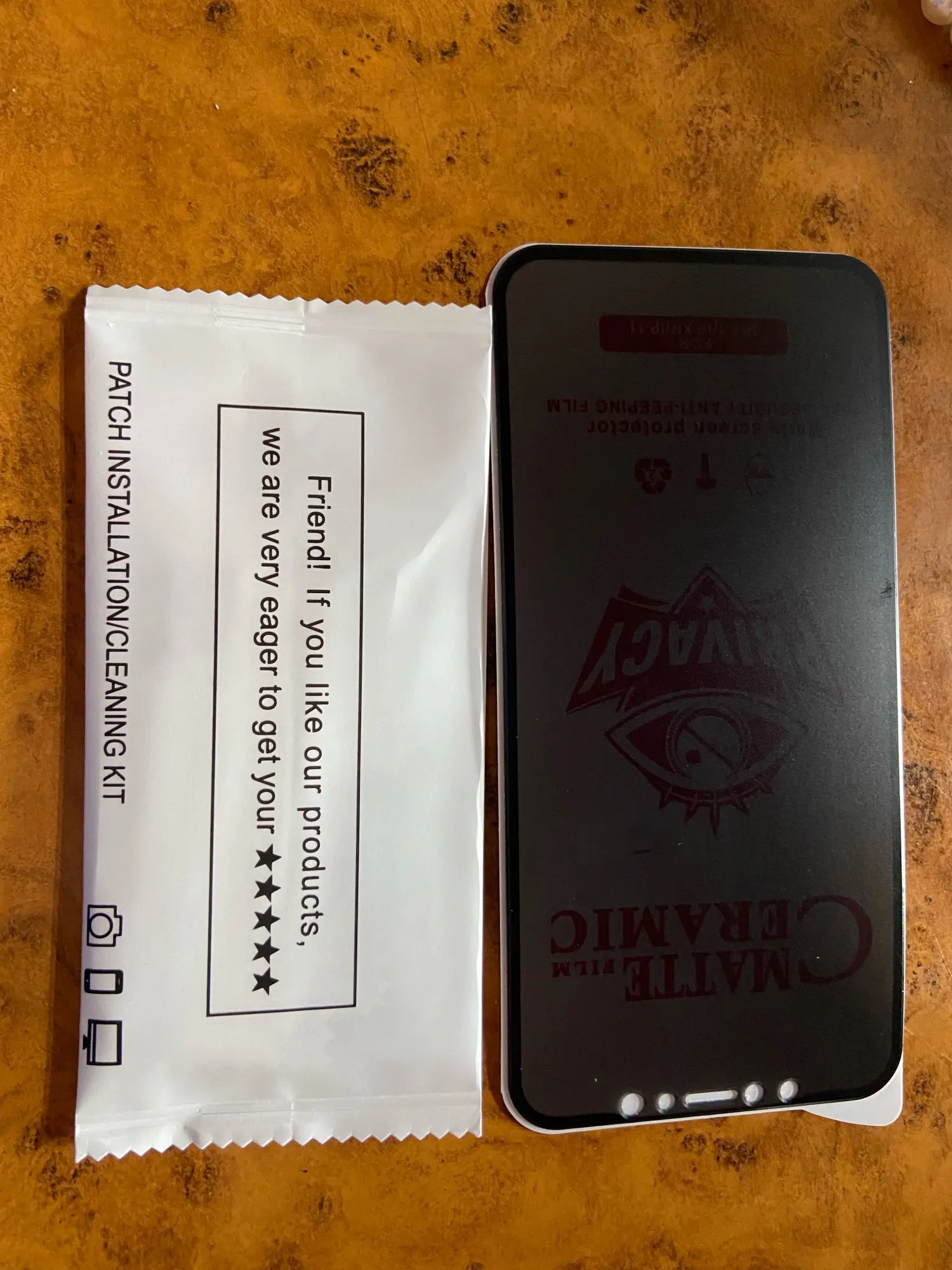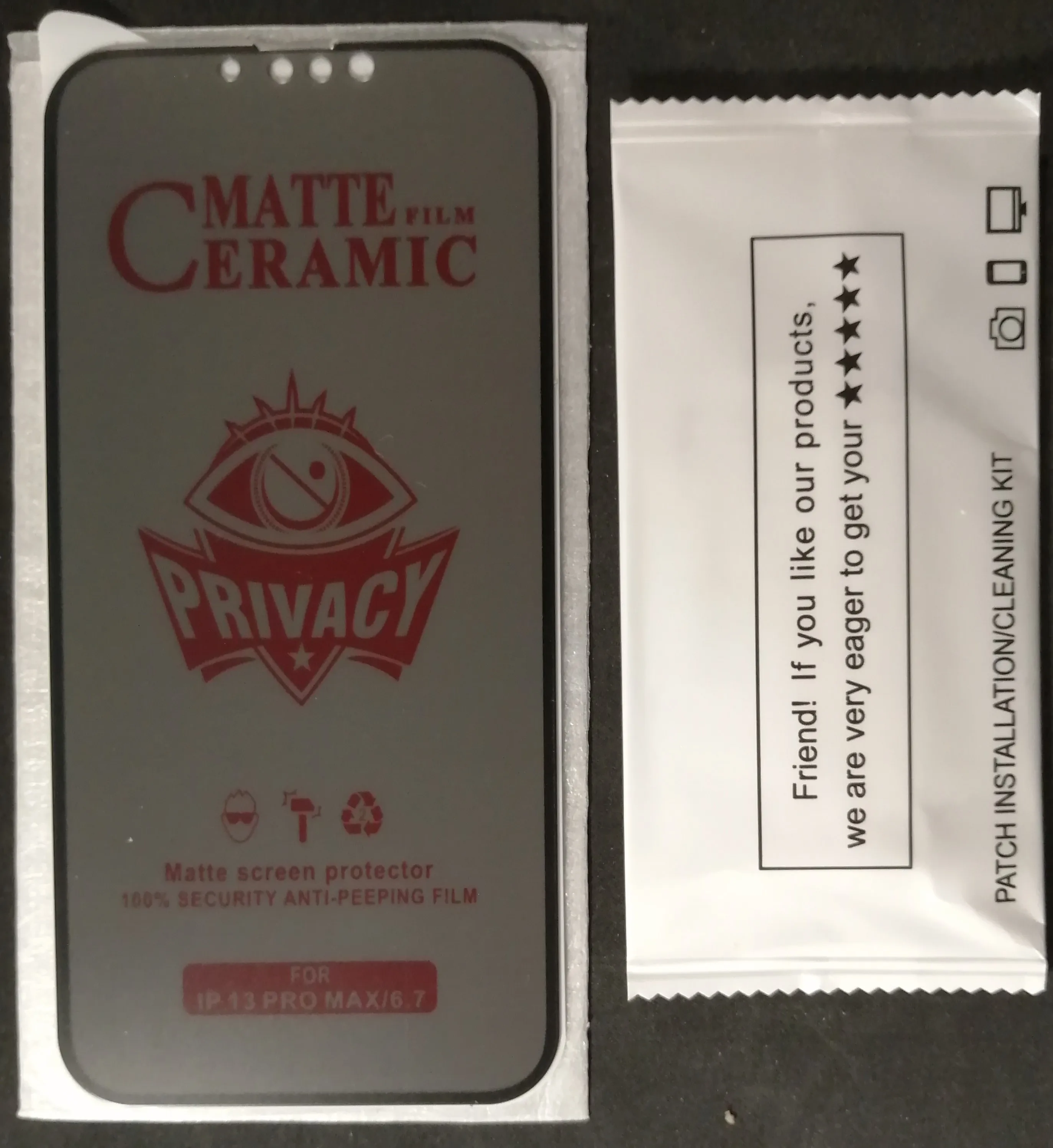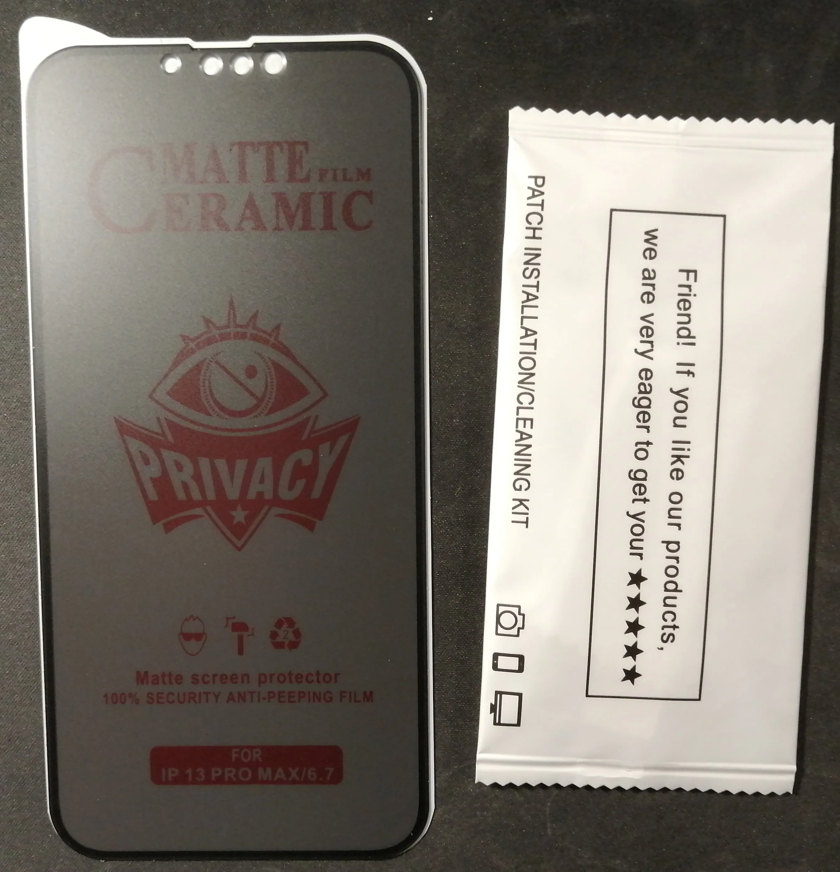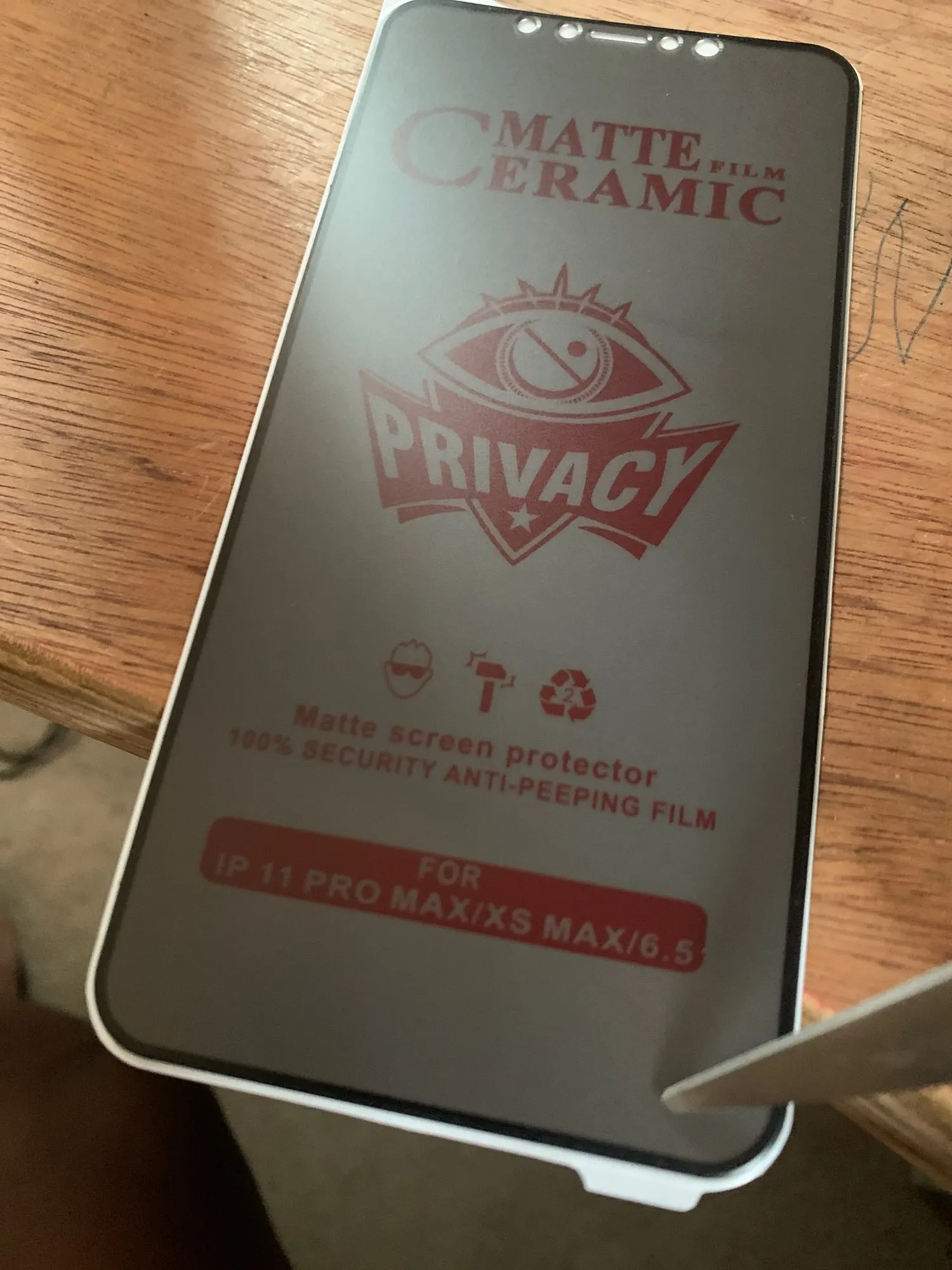 Продукт соответствует, за исключением того, что он немного мал для моего XS max, так как я все еще вижу, что мой экран конический вокруг экранной охраны. Не уверен, какой угол необходим для полного затенения экрана. Я поцарапаю его ножницами и не получил пометку, и это имеет значение, так как они называли его керамическим матовым