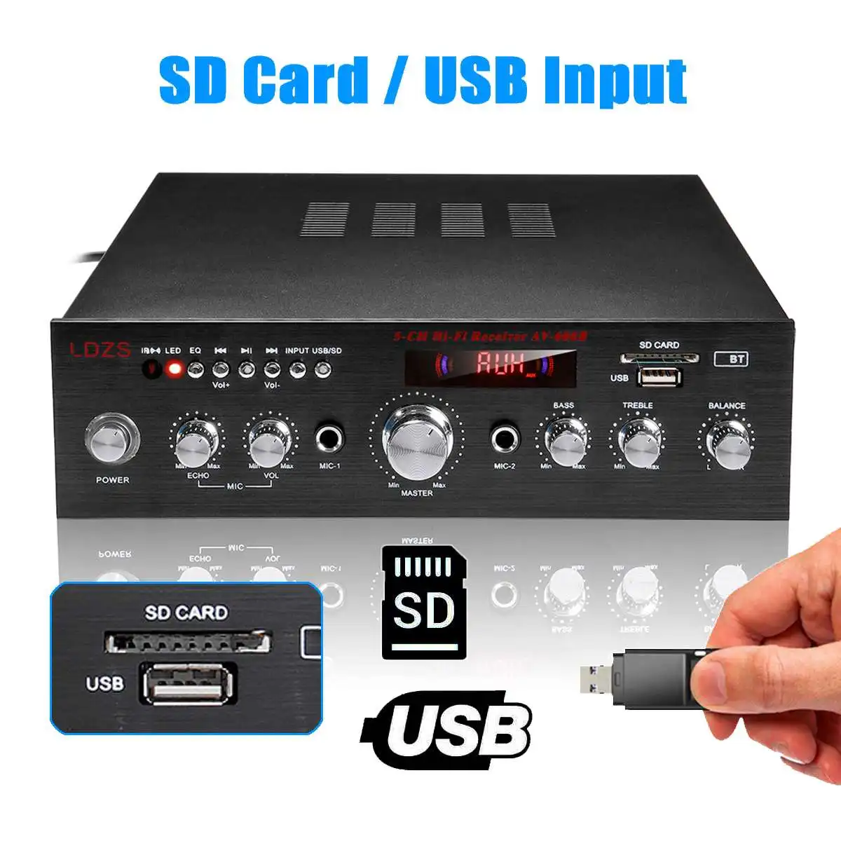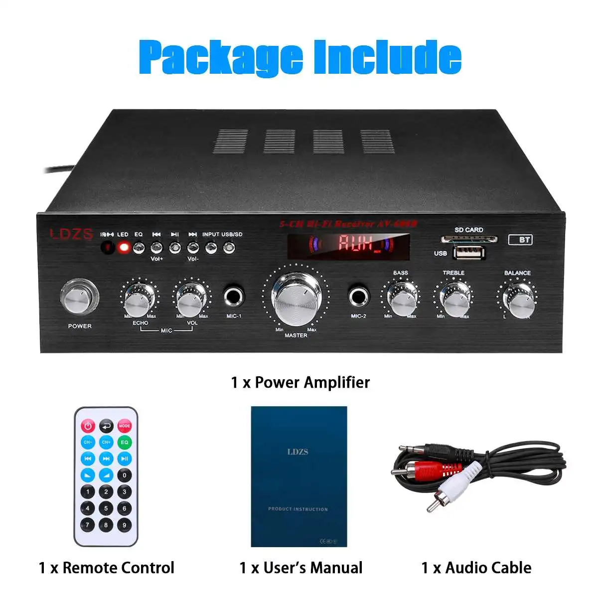 Особенности:-Мини HIFI Цифровой bluetooth аудио усилитель мощности.-Sd-карта, u-диск, воспроизведение формата MP3, Поддержка беспроводного подключения bluetooth.-Поддерживает fm-стерео радио.-Поддержка 2 way вход для микрофона.-С высокими частотами, басами и регулятором громкости, очень прост в использовании.-Низкое Искажение обеспечивает более четкий, сильный и мощный звук.-5 выходной канал.-Модернизированная Высокая мощность 2000 Вт.-С функцией дистанционного управления.-Питание постоянного/переменного тока, подходит для домашнего использования.-Подходит для HiFi, систем домашнего кинотеатра и караоке.