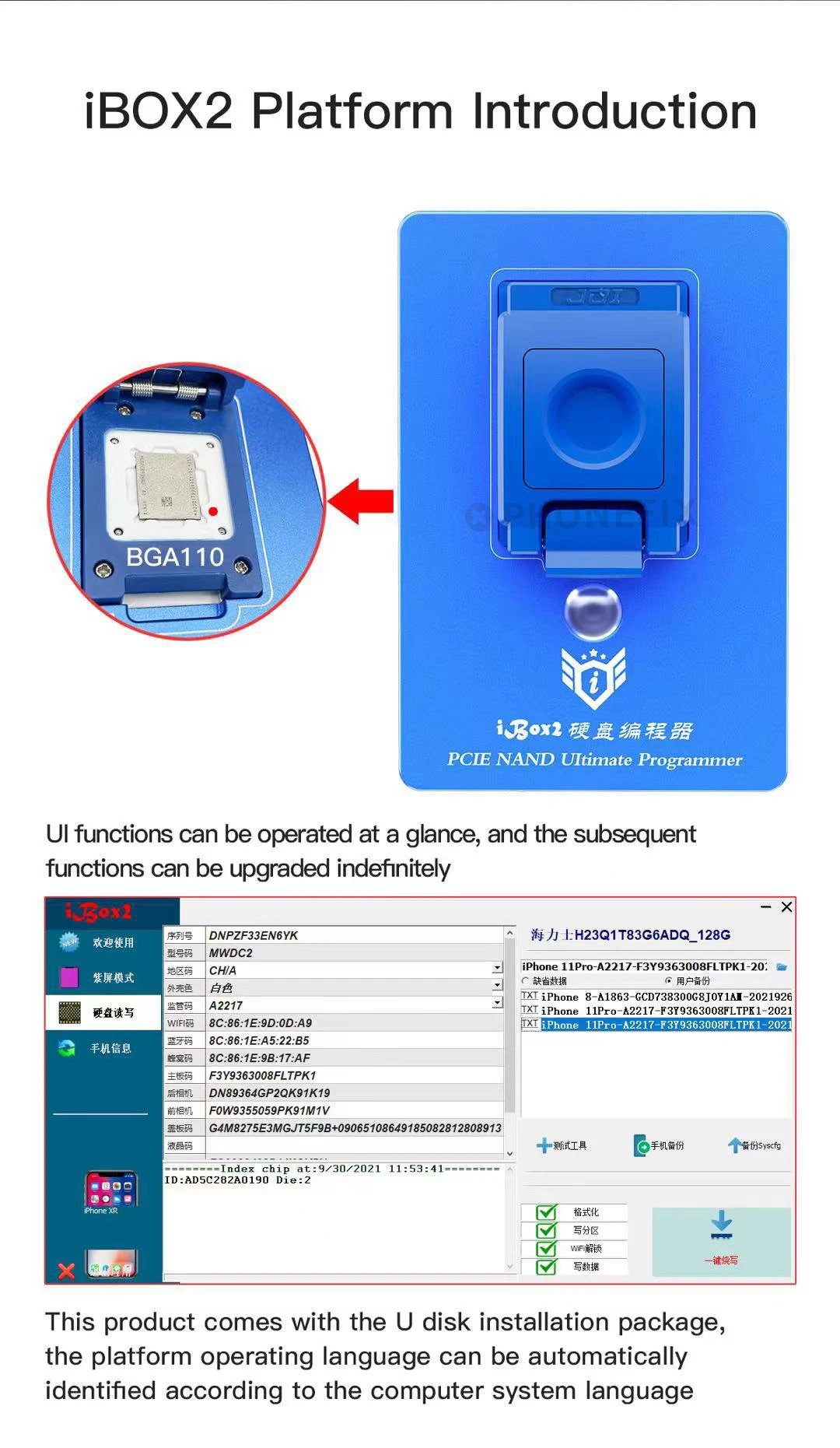 Поддержка полного диапазона NAND Disk устройства ios, Bootcode reflash,syscfg repair.wifi разблокировка и т. д. более 33 моделей включают в себя ix ios устройства поддерживаются ibox2.