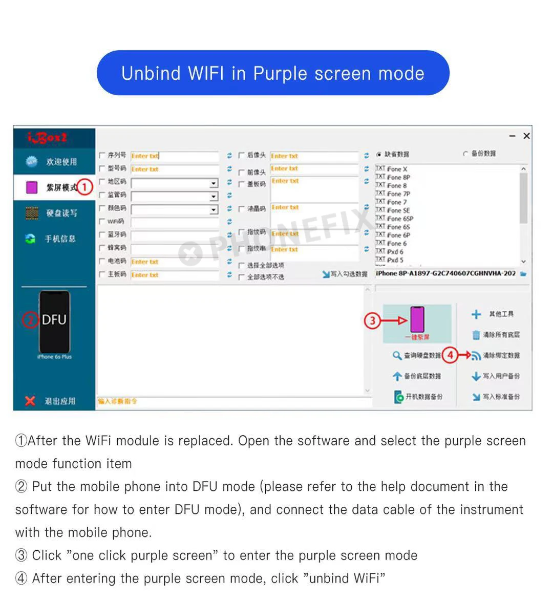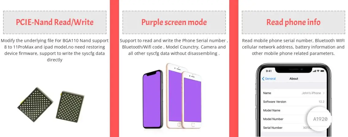 Поддерживает полный спектр устройств ios NAND Disk,Bootcode reflash, syscfg repair. Wifi разблокировка и т. Д.